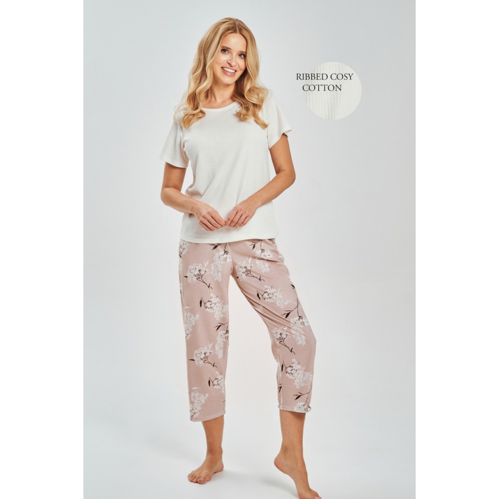 Женская пижама Fiora 3539 S-XL от TARO — это высококачественный польский продукт, созданный для комфортного и естественного сна. Изготовленная из 100% мягкого, дышащего хлопка, она приятна на ощупь и идеально подходит как для теплых, так и для переходных ночей. Короткий трикотажный топ в рубчик с круглым вырезом обеспечивает комфорт и свободу движений. Брюки длиной 3/4, украшенные нежным цветочным принтом, добавляют женственности. Эластичный пояс с хлопковой отделкой гарантирует комфорт и идеальную посадку. Это идеальная женская пижама как для сна, так и для отдыха дома.
