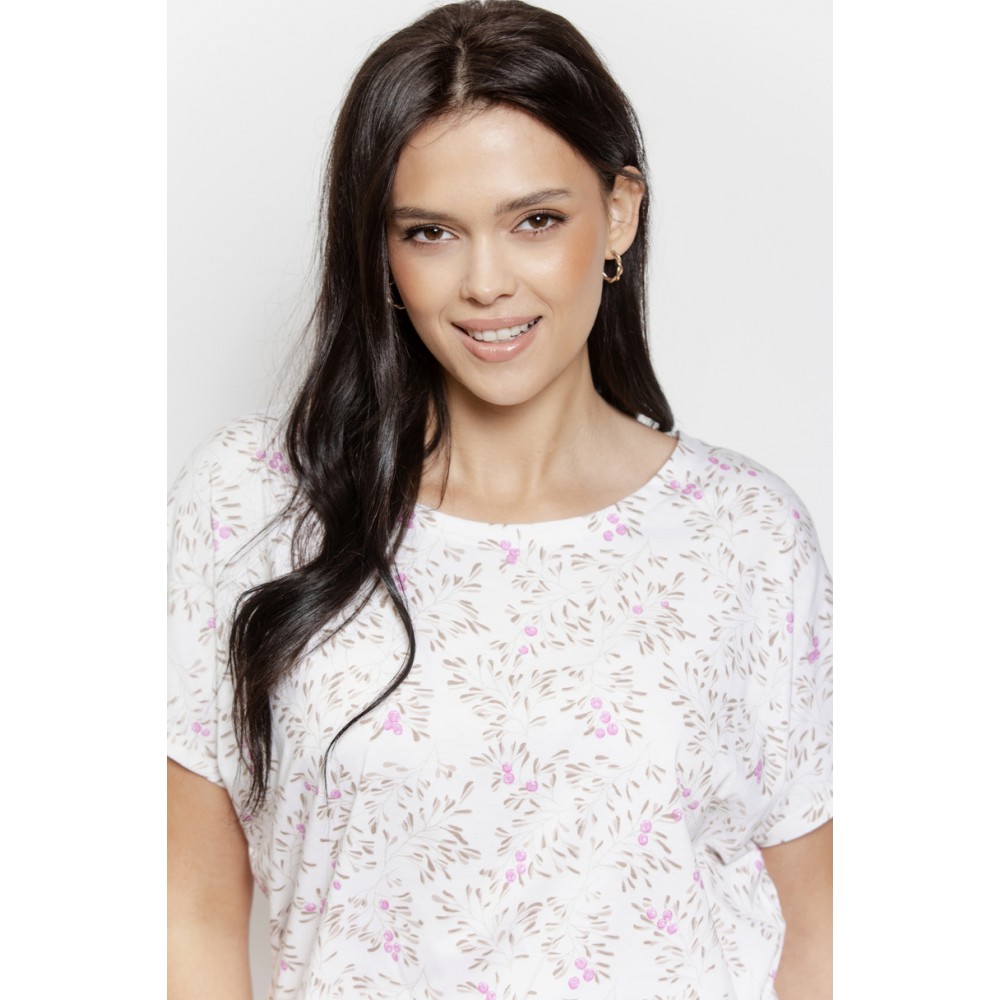 Верхняя часть пижамы представляет собой хлопковую футболку с короткими рукавами и круглым вырезом , украшенную нежным растительным принтом , что придает всему образу свежий и стильный вид. Натуральный хлопок мягкий, дышащий и приятный для кожи. В комплект входят однотонные брюки длиной 7/8 из высококачественной вискозы с добавлением эластана , обеспечивающие легкость, эластичность и идеальную посадку.