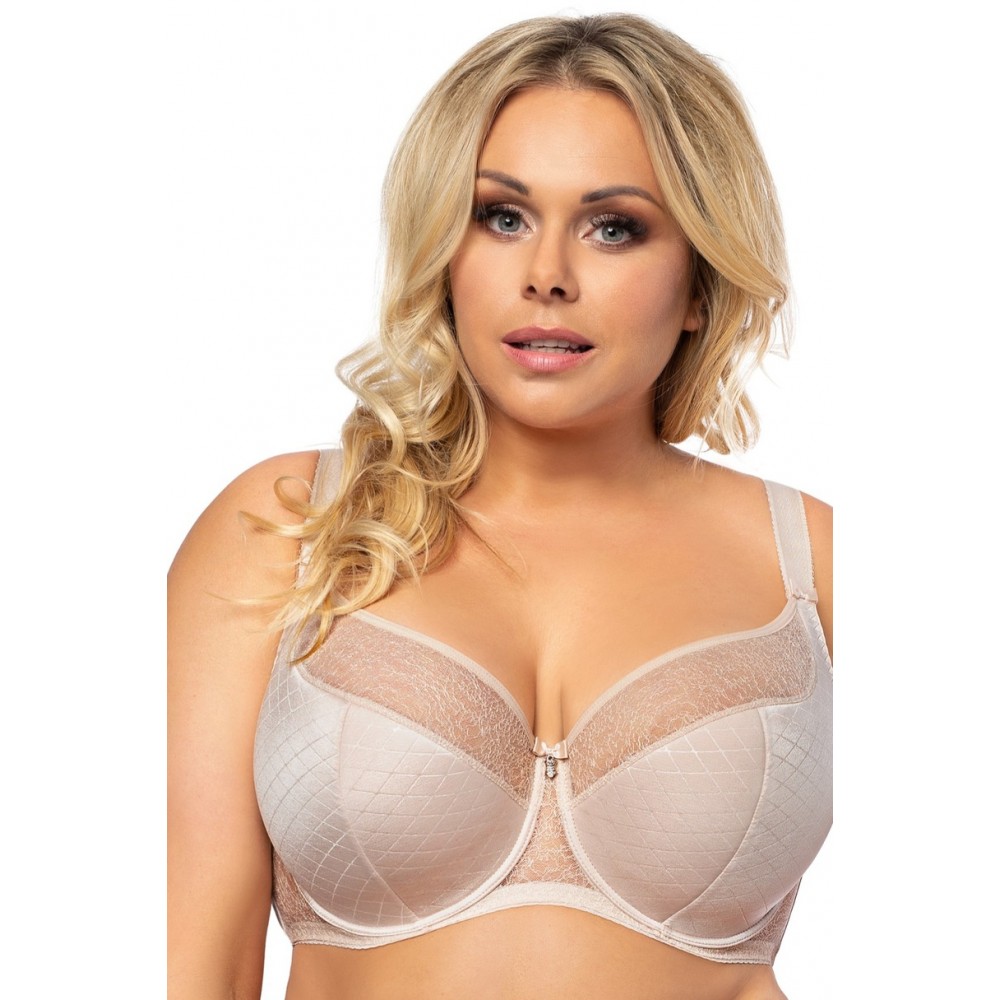 Элегантный, очень удобный бюстгальтер с полужесткими чашками бежевого цвета. Мягкая жесткая пена, используемая в нижней части чашек, позволяет бюстгальтеру идеально поддерживать и собирать бюст по бокам к центру, придавая груди красивую округлую форму и обнажая зону декольте. Нижние части чашек выполнены из трикотажа, украшенного «рельефным» узором. Верхние чашки бюстгальтера выполнены из нежной сетчатой ткани, а их верхний край отделан гладкой резинкой. Середина бюстгальтера, также выполненная из сетчатой ткани, украшенная крошечным бантиком с бижутерией, плотно прилегает к переносице. Чашечки контурируются проволокой, окружающей грудь. Боковины выполнены из прочного трикотажного полотна «Лайкра», также украшены «рельефным» узором и дополнительно оснащены вертикальными косточками, чтобы удерживать бюстгальтер на нужном месте. Застежка — двух- или трехрядный крючок (в зависимости от размера) с трехступенчатой регулировкой по окружности. Все размеры имеют боковые косточки. Бретели регулируемые, несъемные, разной ширины в зависимости от размера, украшены небольшим бантиком в месте соединения с чашкой. Состав: 71% полиамид, 21% хлопок, 8% эластан.