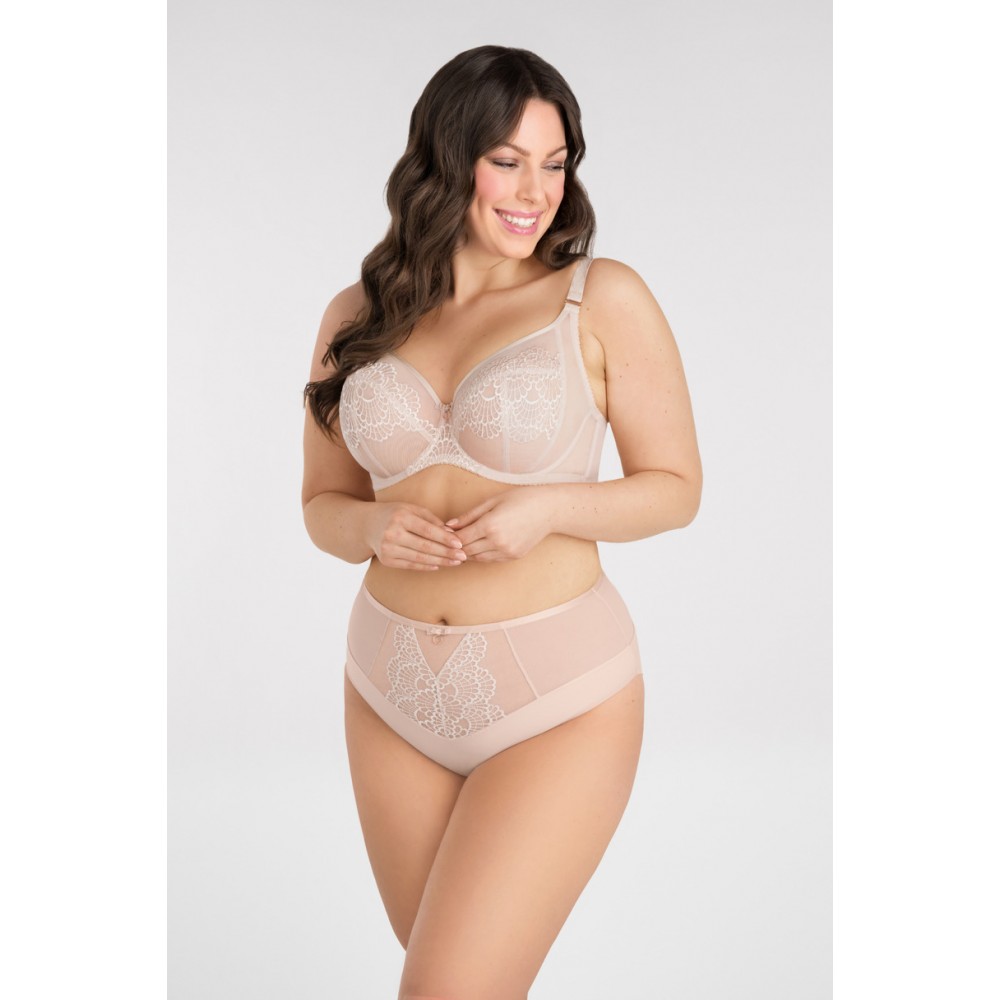 Мягкий бюстгальтер, предназначенный для женщин со средней, большой и очень большой грудью. Обеспечивает эффект очень сильного подъема и сбора груди вовнутрь. Для большего комфорта использования верхний и нижний края обхватной ленты отделаны мягкой окантовкой. Чашечки из 3 частей полностью из прочного тюля с декоративной медной строчкой. Съемные бретели на вырезе с регулировкой и возможностью застегивания различными способами. Спинка из прозрачной лайкры, обеспечивающая очень хорошую посадку и поддержку. Боковые косточки предотвращают скатывание материала. В зависимости от размера два или три ряда крючков с трехступенчатой ​​регулировкой обхвата. Несъемные, регулируемые бретели трех размеров. Металлические элементы цвета розового золота.