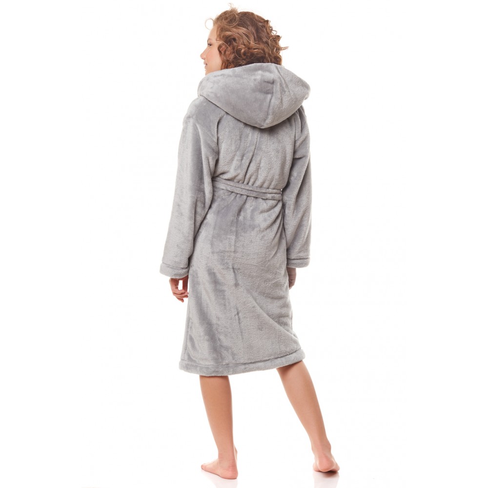 Szlafrok dziecięcy z kapturem, z mięciutkiej, bardzo miłej w dotyku dzianiny typu soft. Wiązany w pasie. Na wysokości bioder wygodne kieszenie. Na wysokości klatki piersiowej naszywka w kształcie pluszowego misia.