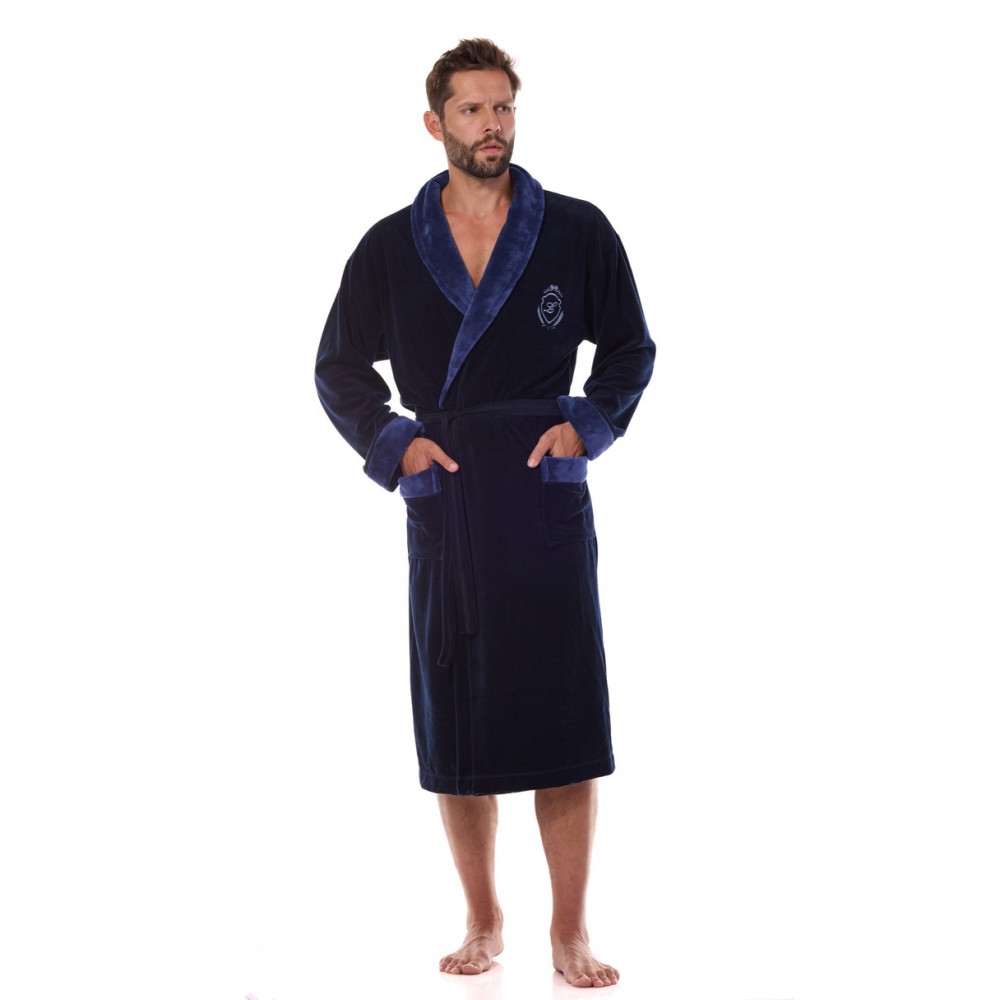 Мужской халат из мягкой ткани, завязывается на талии, с контрастным шалевым воротником. Декоративная..
