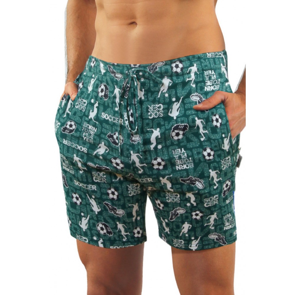 Мужская хлопковая пижама. В комплект входят однотонная футболка с короткими рукавами и шорты с узором и карманами.