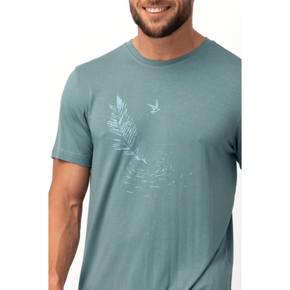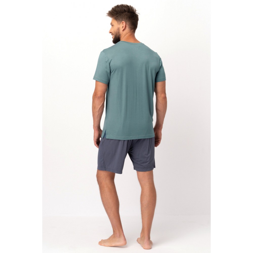 MNS 750 от KEY — стильная и удобная мужская пижама с коротким рукавом. Зелёная футболка с нежным принтом (перо и птица) идеально дополнит спокойную, расслабляющую атмосферу дома. В комплект входят тёмно-серые шорты из лёгкого материала, идеально подходящие для тёплых дней. Благодаря свободному крою и дышащей ткани эта пижама обеспечивает свободу движений и комфорт на протяжении всей ночи. Идеально подходит как для сна, так и для отдыха.