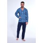Классическая мужская пижама с длинными рукавами, воротником и застёжкой на пуговицы спереди. Набедренные карманы. Однотонные брюки в тон, длинные, прямые. Пижама упакована в коробку.