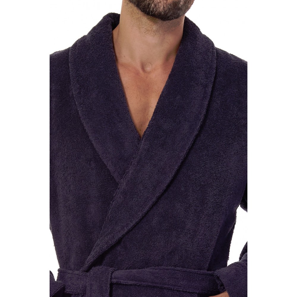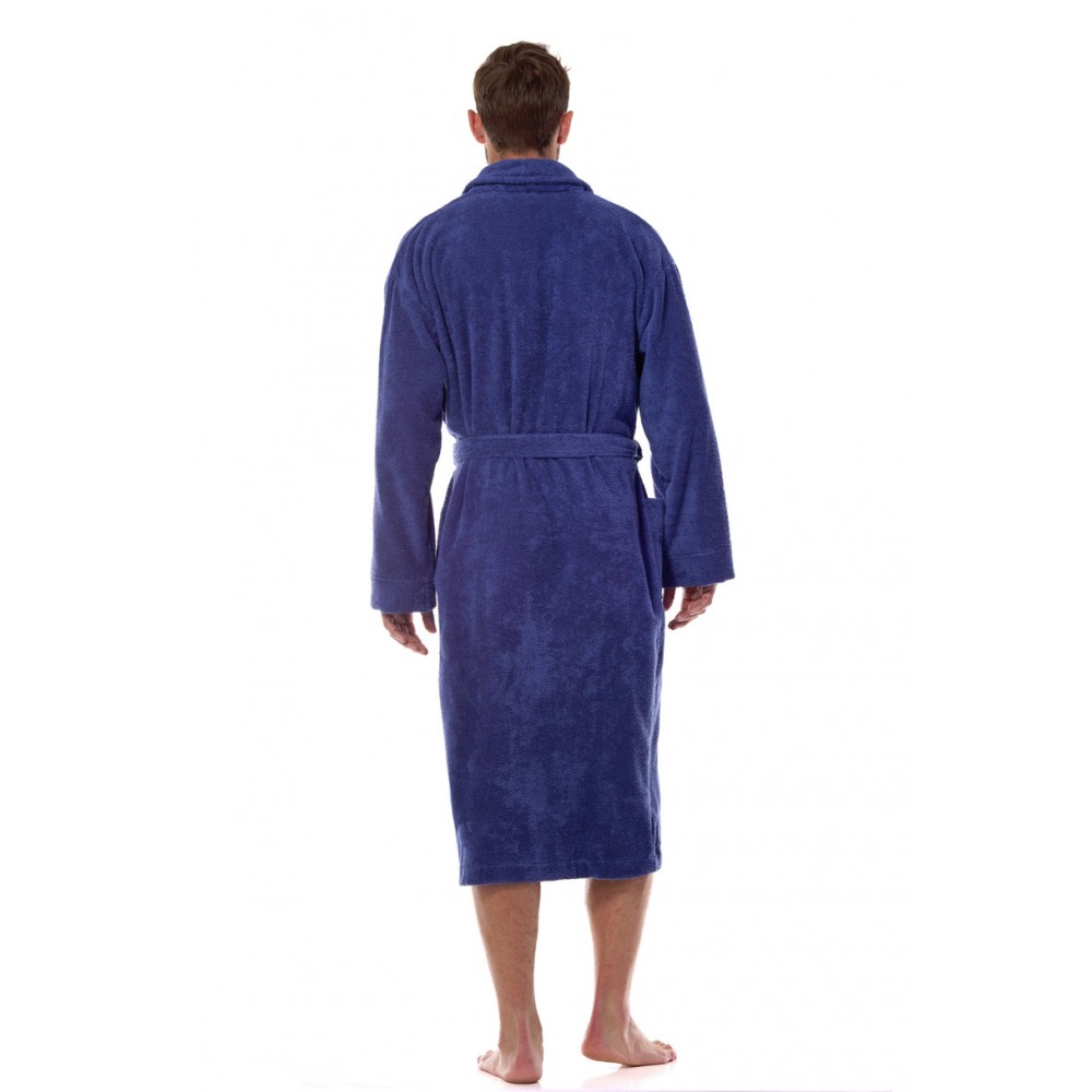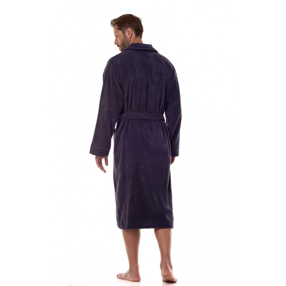 Классический мужской халат из махровой хлопковой ткани с воротником, завязывается на талии. Карманы на уровне бедер.