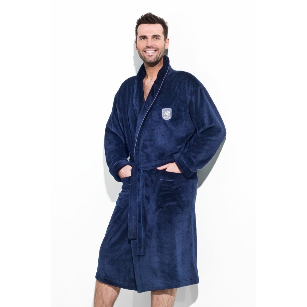 Мужской халат-шаль из мягкой, приятной на ощупь ткани. Отделан контрастной окантовкой, имеет изящную нашивку на груди, карманы на бедрах и завязку на талии.