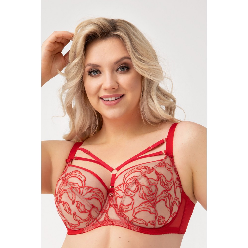 Бюстгальтер мягкий на основе конструкции K496 красного цвета. Декоративные, съемные, регулируемые бретели на декольте. Бюстгальтер, предназначенный для женщин со средней и большой грудью, которые ценят комфорт в ношении, отличную поддержку груди и чувственную элегантность. Дно чашки: вышитый снизу стойкий плен, обшит стойким тюлем телесного цвета. Верх чашки: вышивка, обшита тюлем. Повязка по кругу выполнена из тюля, соединенного сзади прозрачной лайкрой высокой плотности, обеспечивающей очень хорошую поддержку. Бюстгальтер имеет форму, чтобы не давить при ношении. По бокам используются гладкие бретельки с легким блеском: 14, 18, 22 мм, без никеля. Крючок на 2 или 3 ряда с тройной регулировкой обхвата. Состав: 90% полиамид, 7% эластан, 3% полиэстер - РЕМЕНЦЫ - гладкие, с легким блеском на 3 ширины 14, 18, 22 мм КОЛЬЦА И РЕГУЛЯТОРЫ - металл цвета розовый. 2-х и 3-х рядный крючок с тройной регулировкой окружности - Для планки 14 крючок - 2 ряда - Для планки 18, 22 - 3 ряда