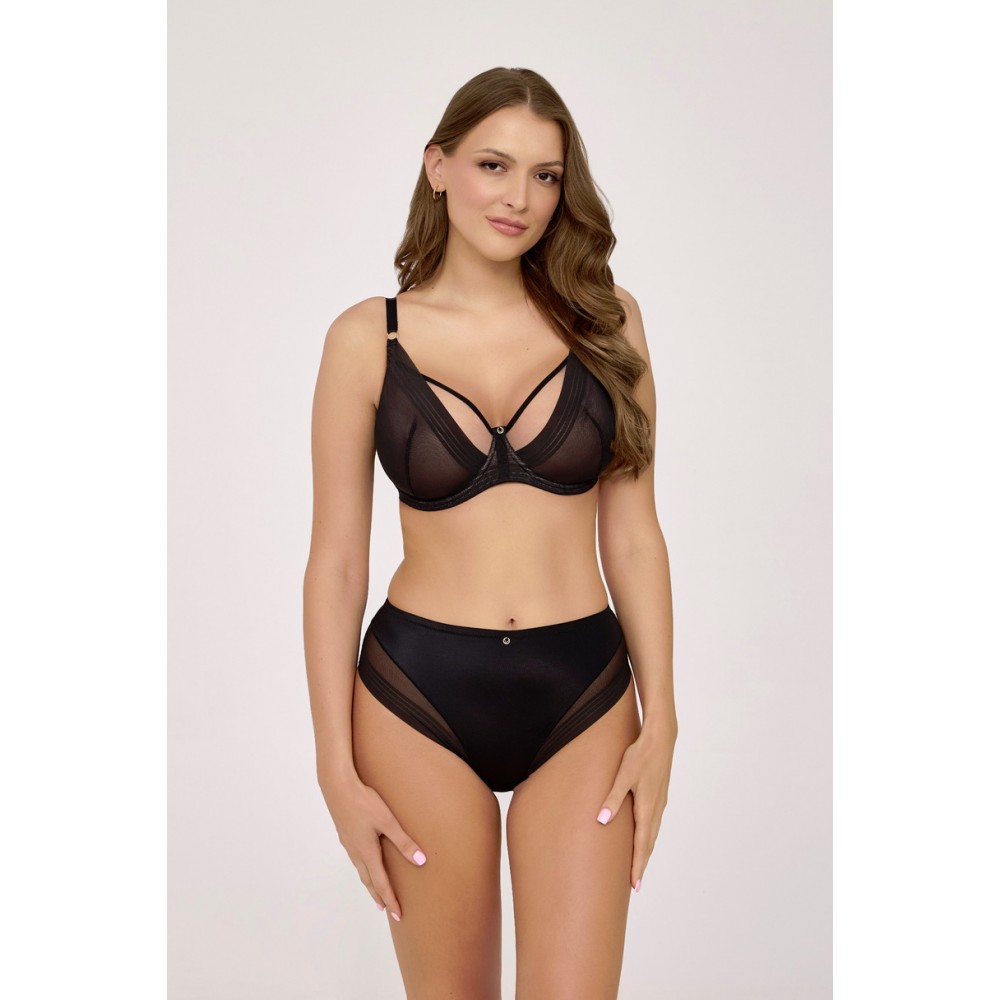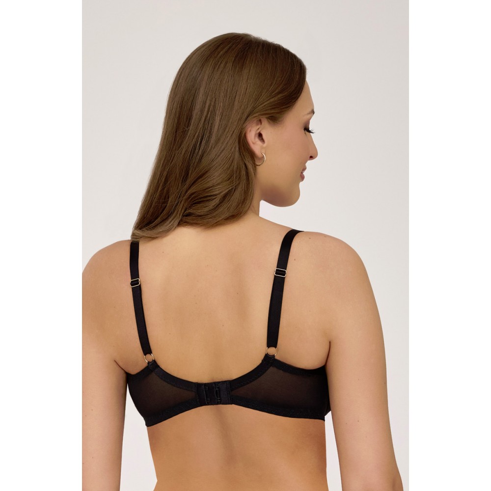 Stabilna konstrukcja z fiszbinami zapewnia doskonałe podtrzymanie i naturalne ułożenie piersi, a lekkie materiały gwarantują komfort noszenia przez cały dzień. Delikatny, biżuteryjny akcent na mostku podkreśla nowoczesny design tego modelu.