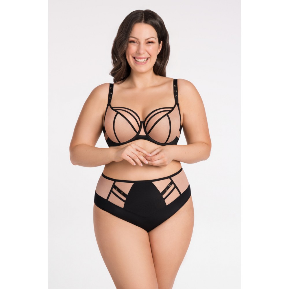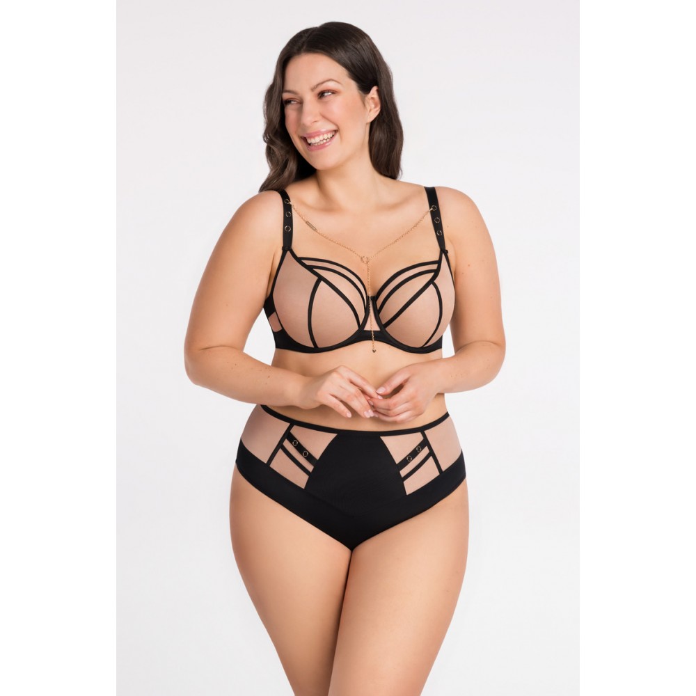 Этот мягкий бюстгальтер предназначен для женщин со средней, большой и очень большой грудью. Он обеспечивает очень сильную поддержку и центрирование благодаря трёхсекционным чашкам из плотного тюля. Швы закрыты матовой атласной лентой. Съёмная декоративная цепочка на вырезе. Для большего комфорта спинка отделана широкой мягкой резинкой. Боковые косточки предотвращают скатывание материала. В зависимости от размера, застёжка на двух- или трёхрядные крючки с трёхпозиционной регулировкой. Несъёмные регулируемые бретели трёх размеров. Светло-золотистые металлические элементы.