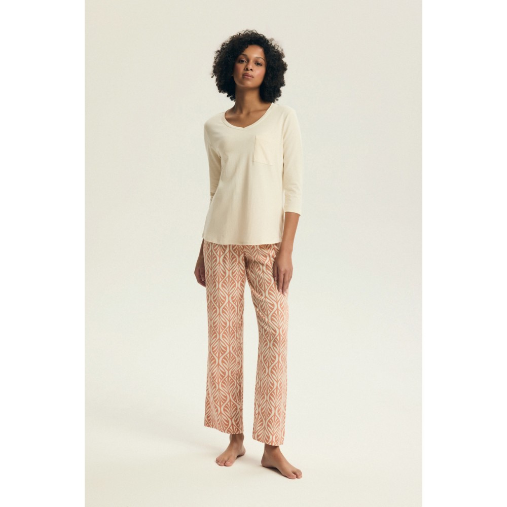 Женская хлопковая пижама. Верхняя часть состоит из футболки с рукавами 3/4, круглым вырезом и декора..