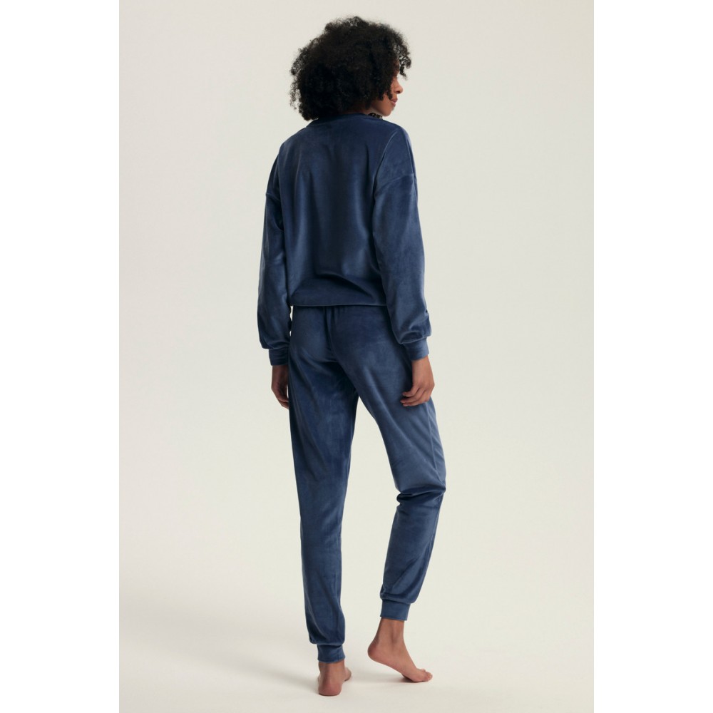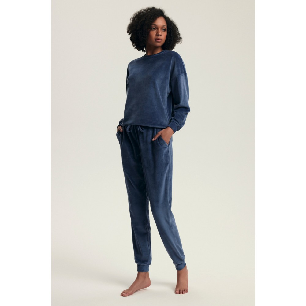 Model dostępny jest w dwóch eleganckich kolorach: pudrowym różu oraz głębokim granacie. Bluzka z długim rękawem oraz spodnie z kieszeniami i ściągaczami u dołu tworzą komfortowy komplet idealny zarówno do snu, jak i jako modny zestaw homewear. Elastyczny pas ze sznurkiem zapewnia dopasowanie do sylwetki, a welurowe wykończenie dodaje luksusowego charakteru.