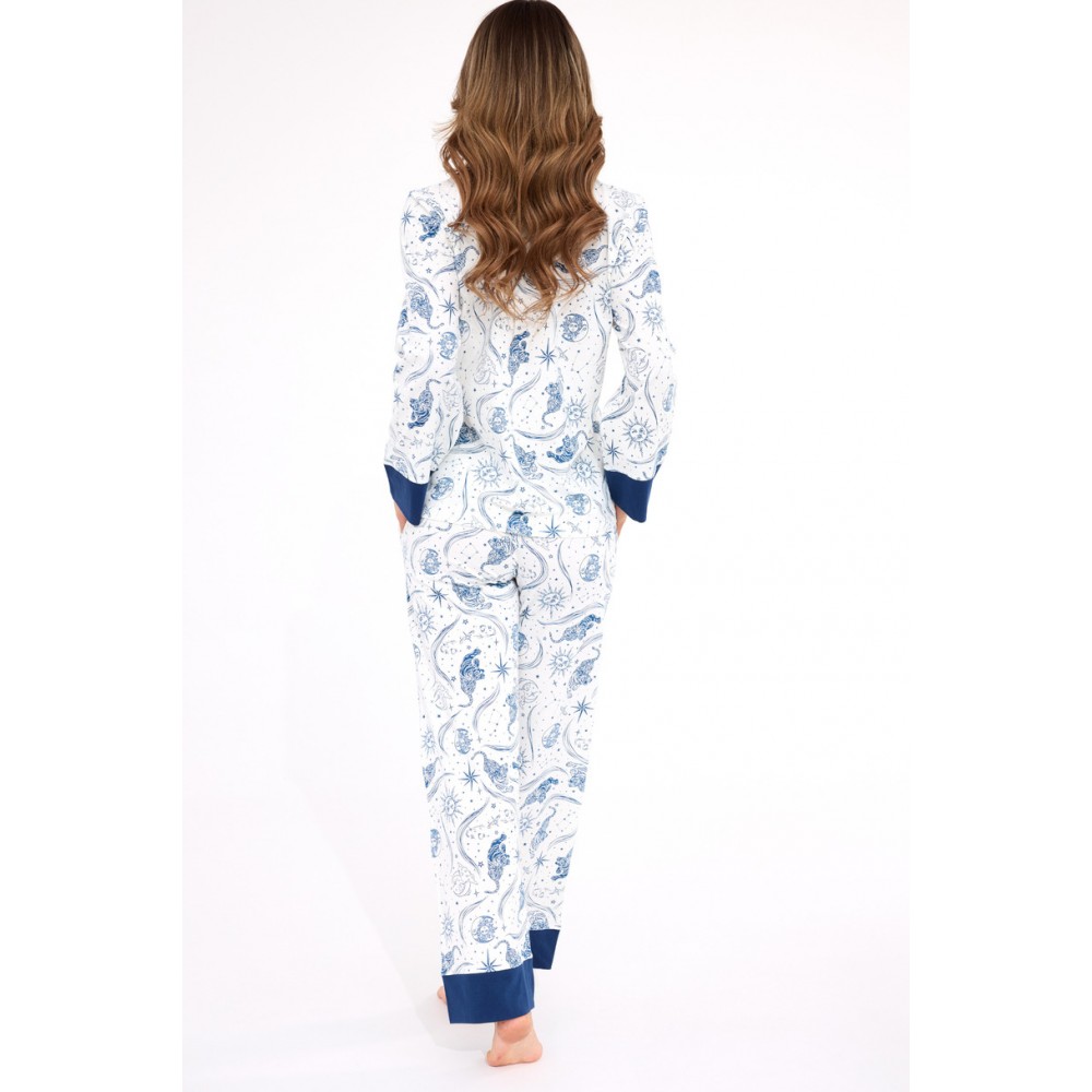 Piżama damska AMBER DR 514/443 to stylowy i komfortowy komplet idealny na każdą porę roku. Wykonana w 100% z miękkiej, oddychającej bawełny, zapewnia wygodę podczas snu i relaksu w domu. Rozpinana bluzka z długim rękawem wykonana z wzorzystej tkaniny prezentuje się kobieco i elegancko. Do kompletu dołączone są długie spodnie z prostymi nogawkami i praktycznymi kieszeniami, które gwarantują pełną swobodę ruchu. Piżama zapakowana w estetyczne pudełko – doskonały pomysł na prezent.