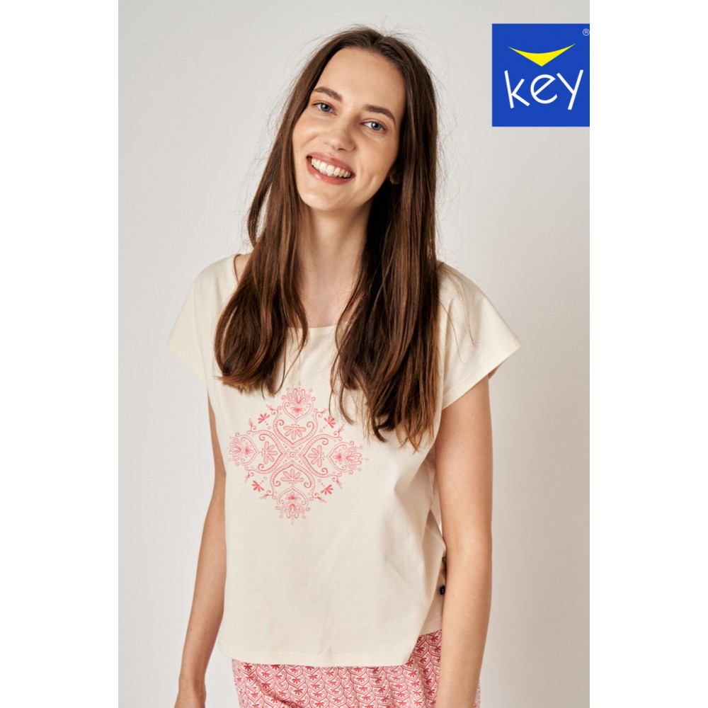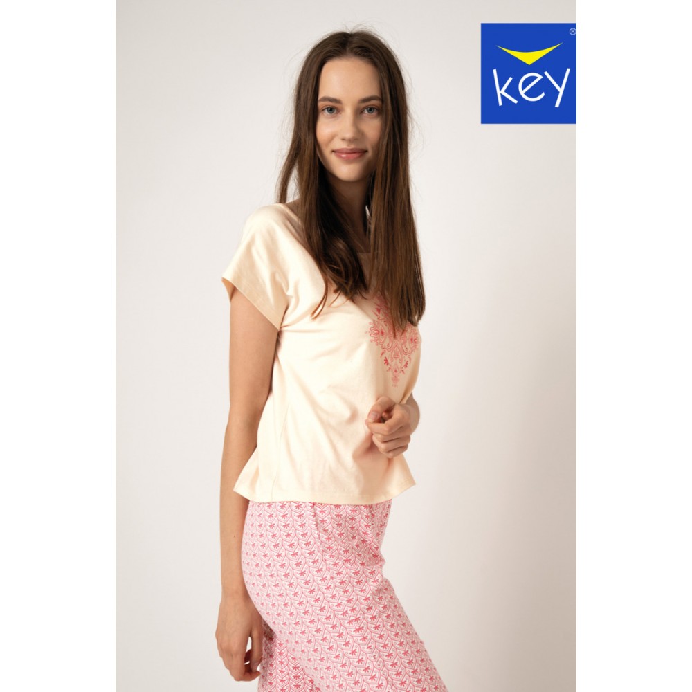 Женская хлопковая пижама. Капри с нежным принтом и простая футболка с короткими рукавами и спереди.