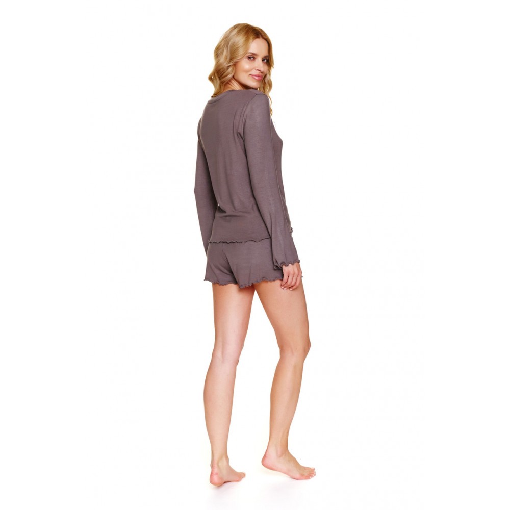 Bluzka z długim rękawem, zaokrąglonym dekoltem i falbankowym wykończeniem prezentuje się lekko i kobieco. Do kompletu dołączone są krótkie spodenki, również ozdobione delikatną falą, które idealnie komponują się z górą, tworząc spójny, romantyczny zestaw. Subtelny, modny kolor dodaje całości elegancji.