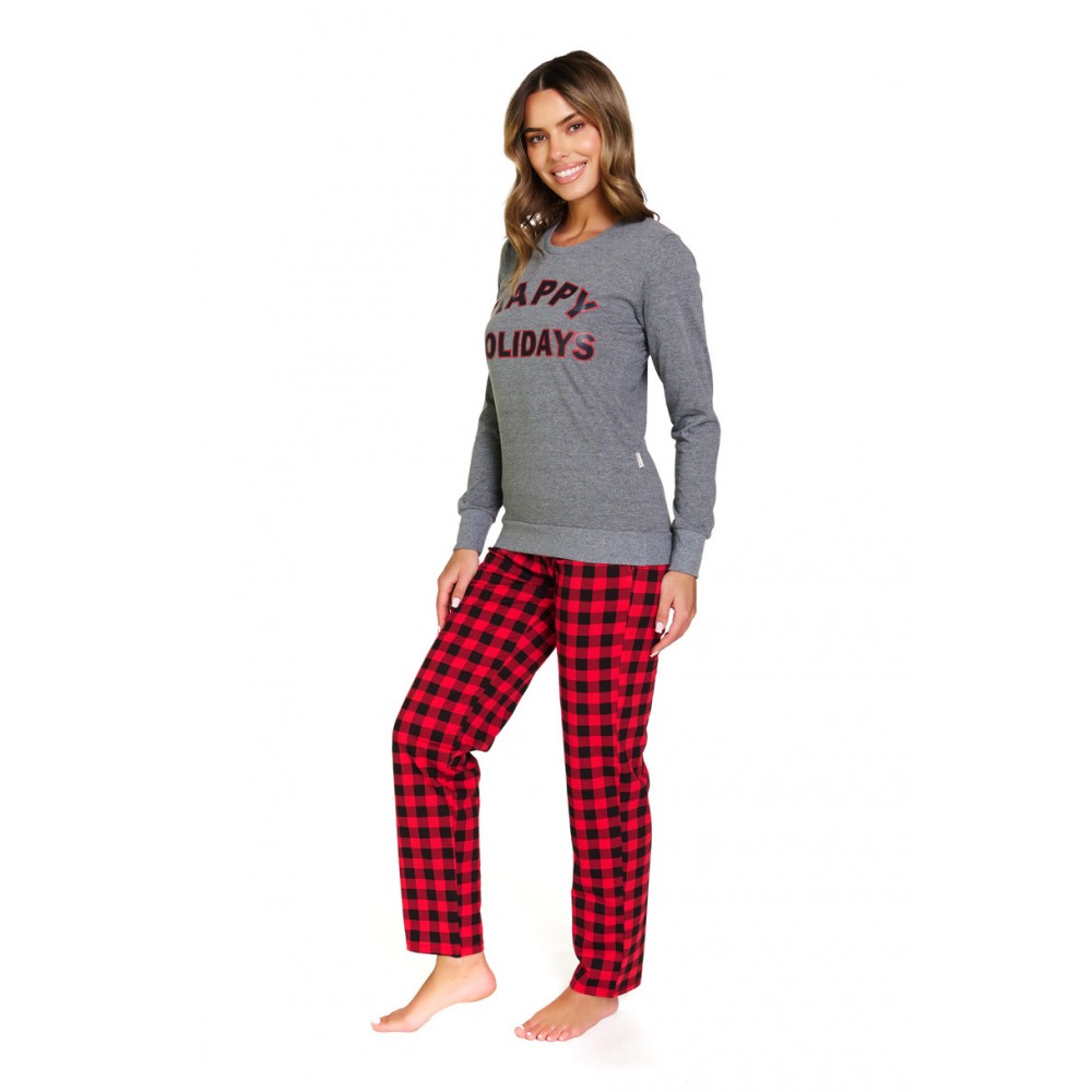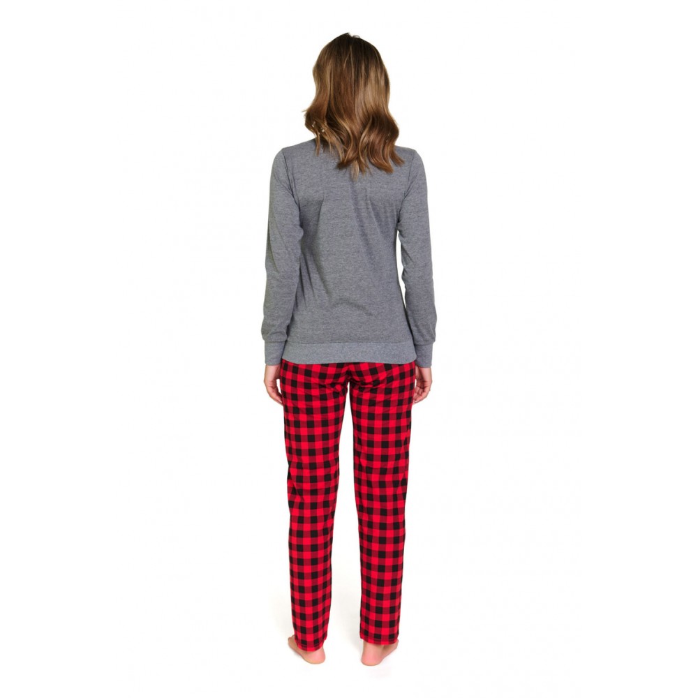 Górę piżamy stanowi bluzka z długim rękawem zakończonym ściągaczem, z przodu ozdobiona modnym nadrukiem, który nadaje całości kobiecego charakteru. Długie spodnie w kratę z prostymi nogawkami idealnie komponują się z górą zestawu, tworząc klasyczny, ale nowoczesny komplet.