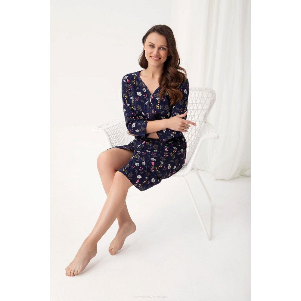 Женский халат с рисунком, округлый V-образный вырез, застежка на молнию, с карманами, рукава 3/4, длина до колена.
