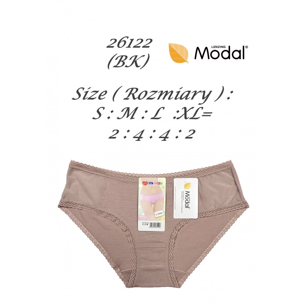 Женские плавки-бикини из мягкой, приятной на ощупь ткани. Украшены нежным кружевом. Упаковка 12 шт. разных цветов. В упаковке разные размеры (S, M, L, XL). Состав: 94% модал, 6% эластан.
