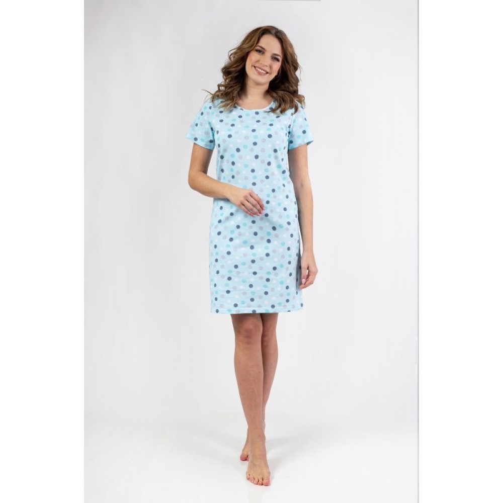 Женская хлопковая рубашка с короткими рукавами и цветным узором в горошек. Круглый вырез, короткие р..