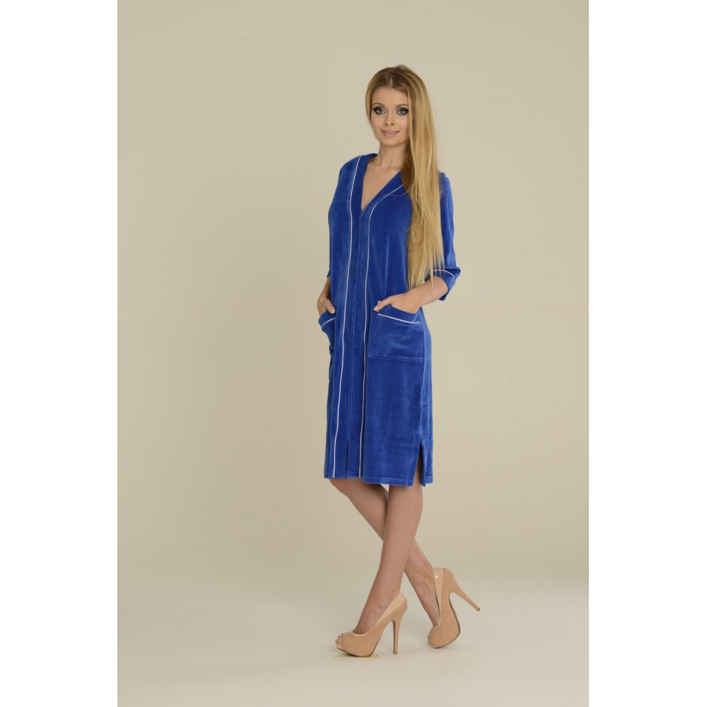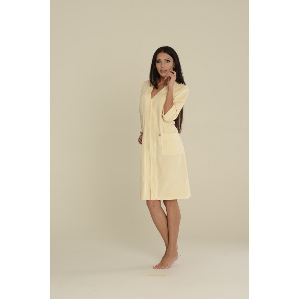 Короткий женский халат из мягкого бархата (80% хлопок, 20% полиамид), с рукавами 3/4, застежкой на молнию и двумя удобными карманами.