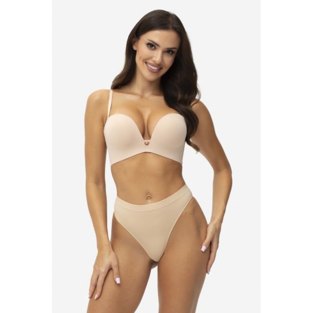 Biustonosz damski JOYCE Double Push-Up to nowoczesna propozycja w formie eleganckiego półgorsetu, zaprojektowana z myślą o małych i średnich biustach. Specjalistyczna konstrukcja z głębokim wycięciem skutecznie unosi, zbiera i modeluje piersi, zapewniając wyraźny efekt powiększenia oraz spektakularnie podkreślony dekolt. To idealny wybór do stylizacji z dużym dekoltem, sukienek wieczorowych oraz jako minimalistyczny top pod marynarkę. Model wykonany z wysokiej jakości materiału (85% poliamid, 15% elastan) gwarantuje trwałość, elastyczność i doskonałe dopasowanie do sylwetki. Gładkie, bezszwowe miseczki sprawiają, że biustonosz nie odznacza się pod ubraniem, zapewniając estetyczny i nowoczesny wygląd. Uniwersalny beżowy kolor doskonale komponuje się z jasnymi stylizacjami i pozostaje niewidoczny pod odzieżą. Funkcjonalność modelu JOYCE podnosi trzystopniowa haftka umożliwiająca regulację obwodu oraz w pełni regulowane ramiączka, które pozwalają na indywidualne dopasowanie i optymalne podtrzymanie. To połączenie technologii modelowania, komfortu oraz minimalistycznego designu klasy premium.