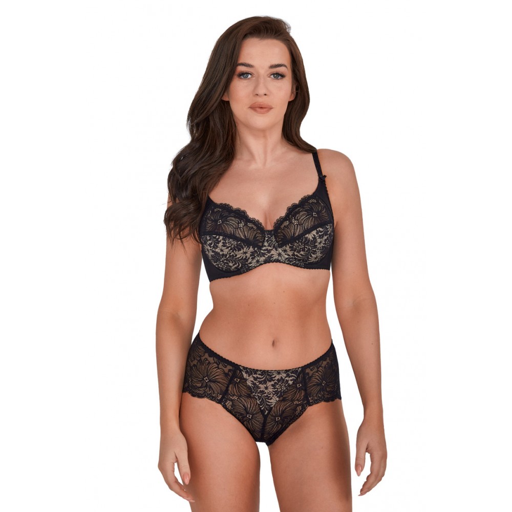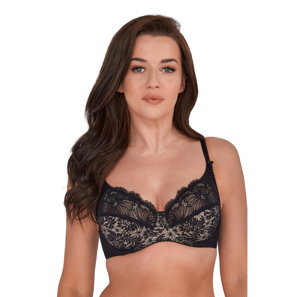 Специальная конструкция с боковой вставкой собирает грудь вовнутрь, поддерживает её и предотвращает её расползание. Боковые косточки стабилизируют весь бюстгальтер и предотвращают скатывание материала. Менее эластичная лента под грудью обеспечивает хорошую поддержку даже для больших размеров. Плотно прилегающая конструкция с приподнятой линией чашек обеспечивает полное покрытие и большую интимность, а линия чашек доходит до бретелей, усиливая эффект подтяжки.