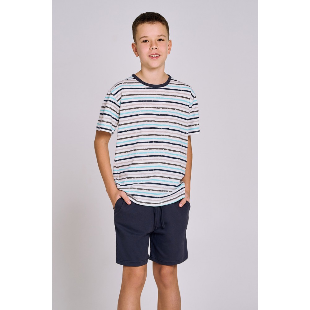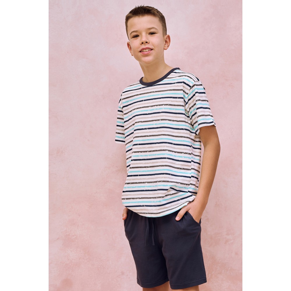 Классическая хлопковая пижама для мальчиков с короткими рукавами, полосатой футболкой и круглым вырезом. Комплектуется однотонными шортами с карманами и регулируемым шнурком.