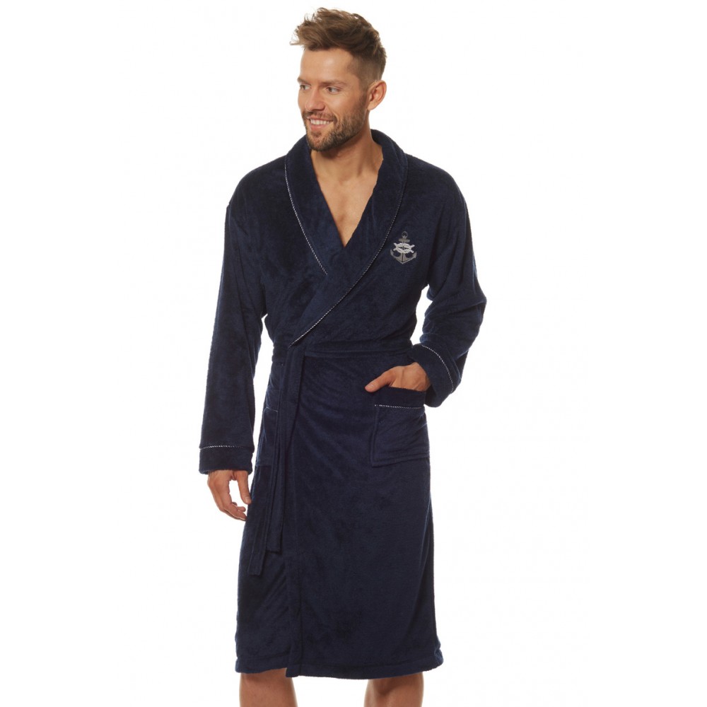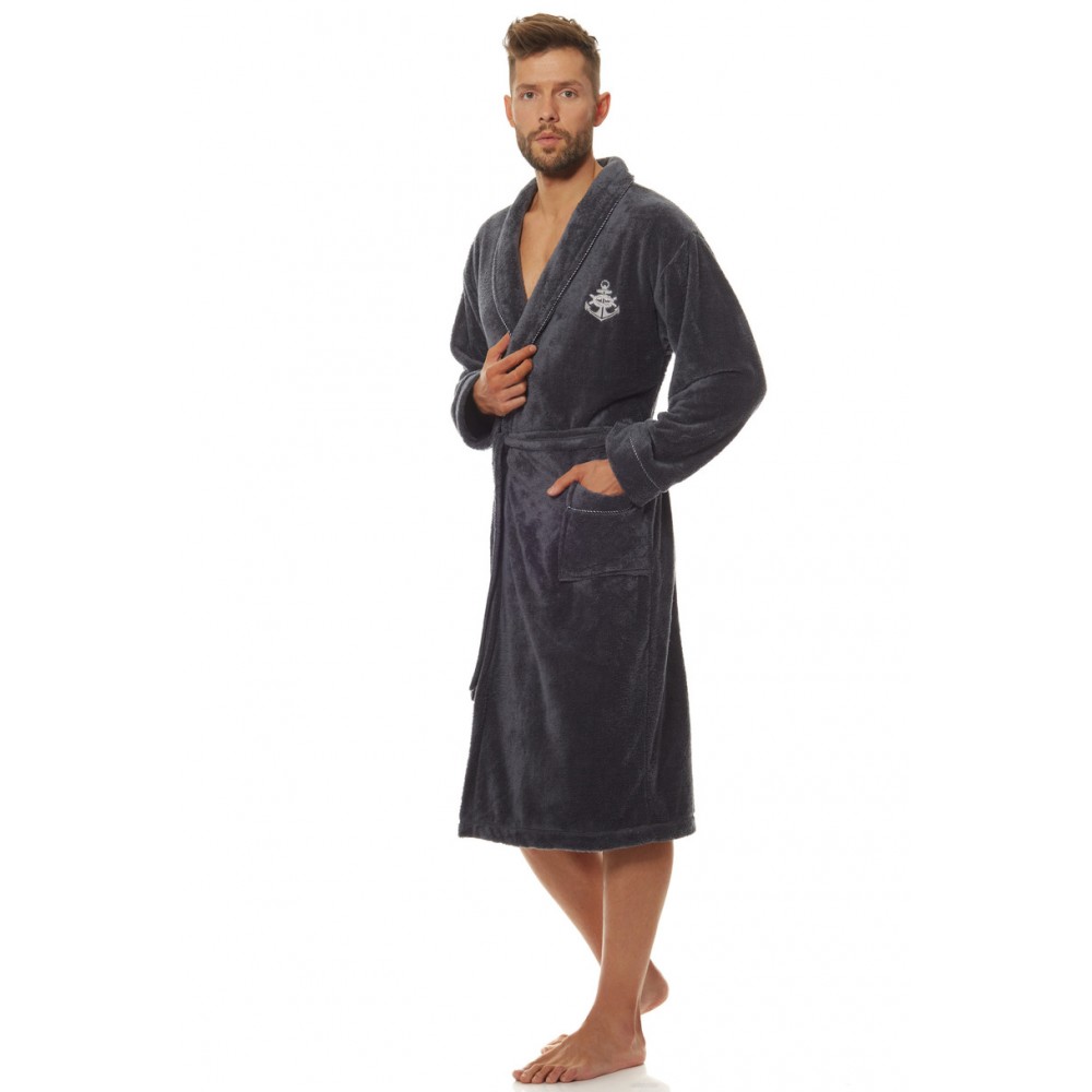 Мужской халат с шалевым воротником из мягкой трикотажной ткани, завязывается на талии, карманы на уровне бедер.