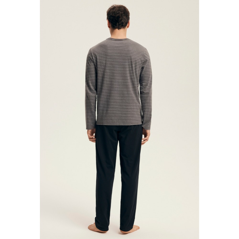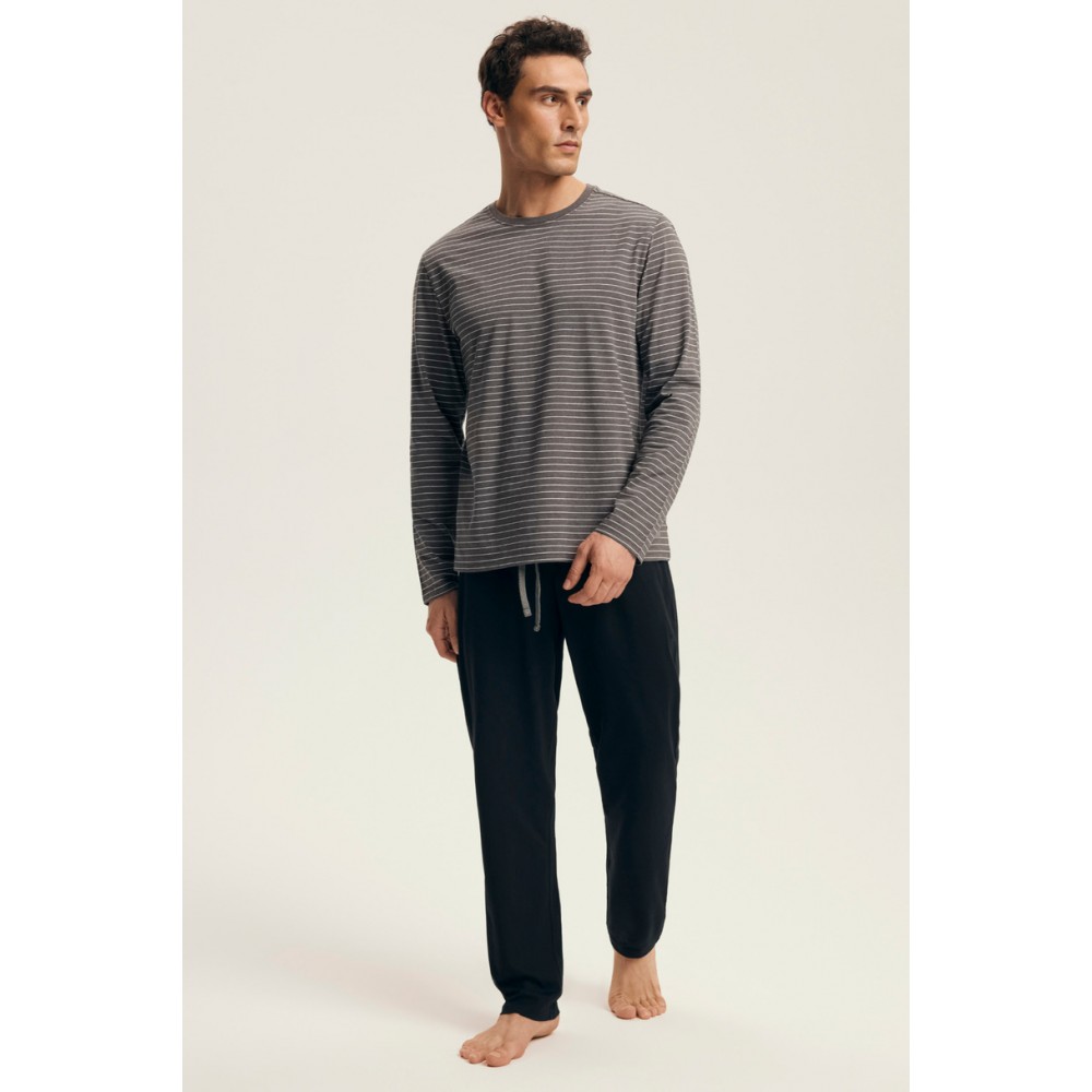 Выберите простоту и комфорт с НОВОЙ мужской пижамой 43455. Изготовленный из 100% мягкого, дышащего хлопка, этот комплект гарантирует комфортный сон круглый год. Топ с длинными рукавами и серыми полосками выглядит современно и универсально, а черные брюки с завязкой на талии обеспечивают идеальную посадку. Это отличный выбор для мужчин, ценящих классический стиль и повседневный комфорт.