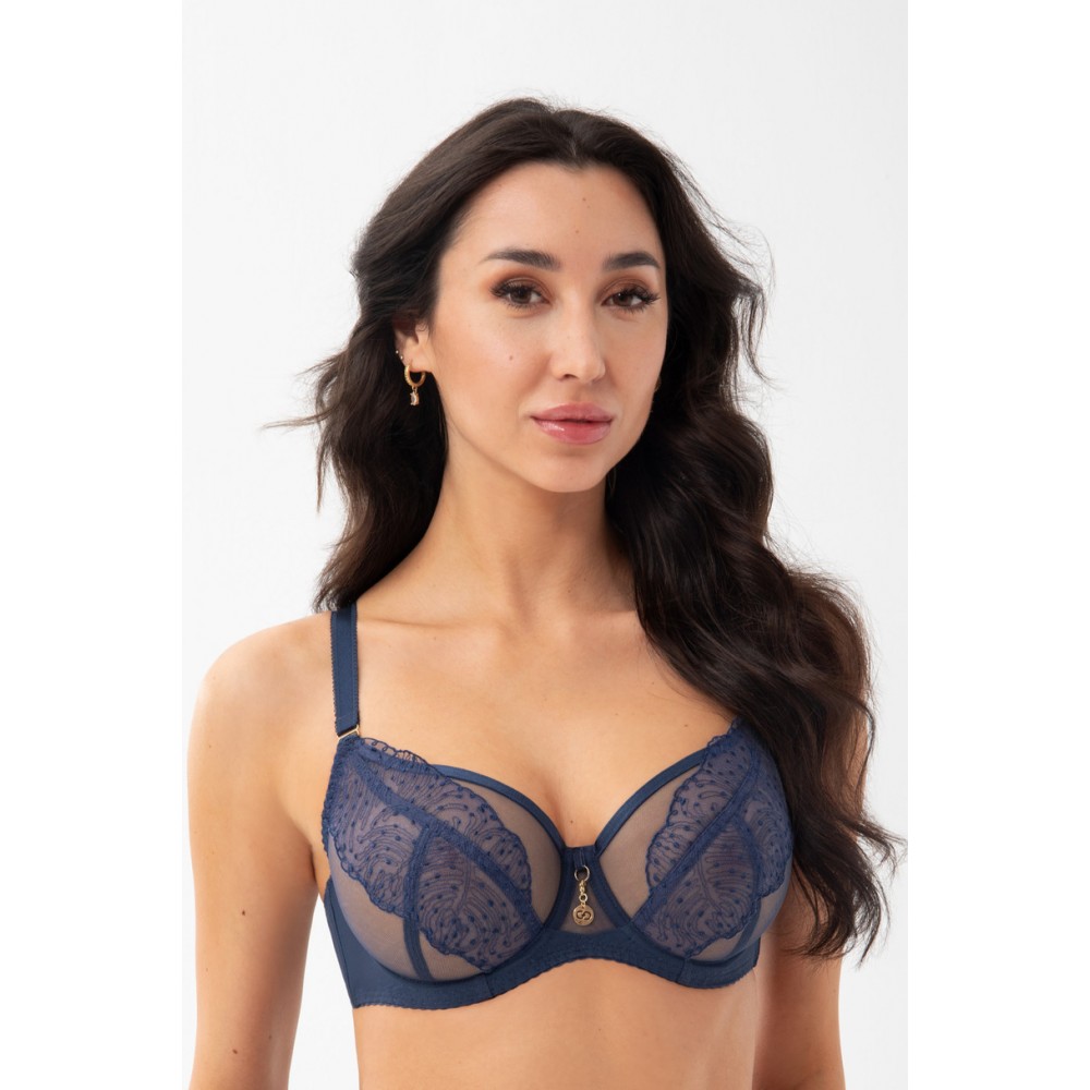 Мягкий бюстгальтер предназначен для женщин со средней и большой грудью. Обеспечивает эффект подъема и сборки бюста внутрь, чашки из 3 предметов по вышивке на стойком фатине. Верхний край чашки обработан тесьмой, плавно переходит на лямку, обеспечивая лучшую поддержку бюста. Золотой съемный шарм с логотипом на баске. Спинка из прозрачной лайкры обеспечивает очень хорошую посадку и поддержку. Боковые косточки предотвращают свертывание материала. В зависимости от размера двух- или трехрядные крючки с трехступенчатой регулировкой окружности. Неотстегивающиеся регулируемые лямки трех ширин, дополнительно укрепленные бархатной лентой больших размеров. Металлические элементы золотистого цвета (без никеля). Состав: 90% полиамид, 7% эластан, 3% полиэстер.