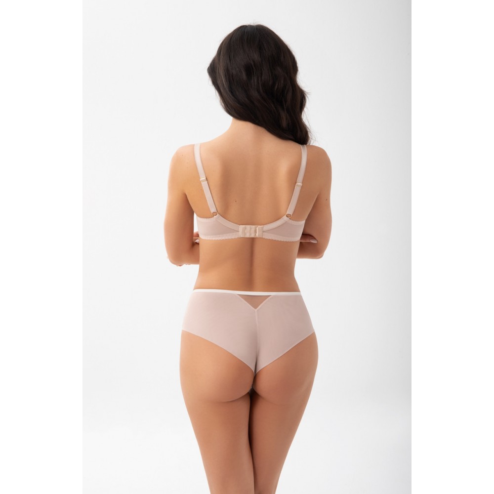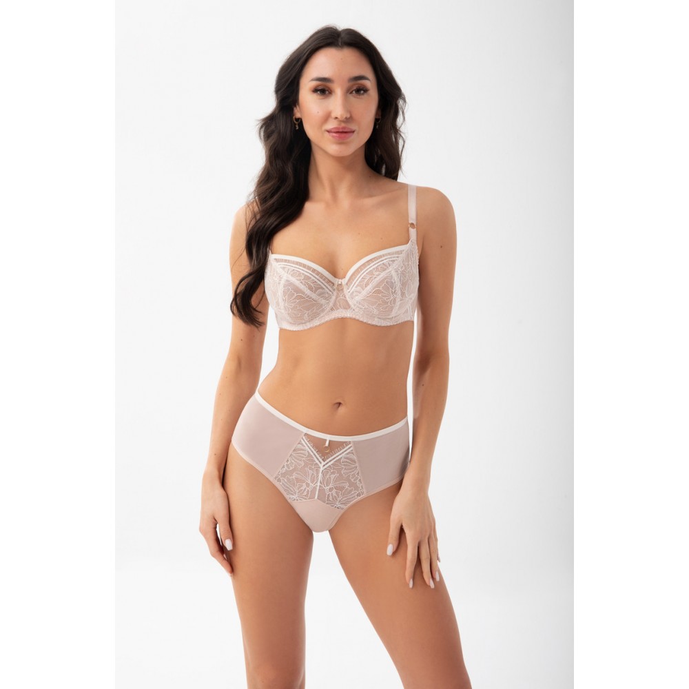Мягкий бюстгальтер для женщин со средней и большой грудью, приподнимающий и собирающий грудь. Чашечки из трёх частей, изготовленные из прочного кружева поверх плотного тюля. Верхний край чашки отделан широкой полосой. Задняя часть выполнена из прозрачной лайкры для идеальной посадки и поддержки. Боковые косточки предотвращают скатывание материала. В зависимости от размера доступна застёжка на два или три ряда крючков с трёхпозиционной регулировкой. Несъёмные регулируемые бретели трёх размеров ширины, дополнительно усиленные бархатной тесьмой в больших размерах. Металлические элементы светло-золотистого цвета (без никеля).