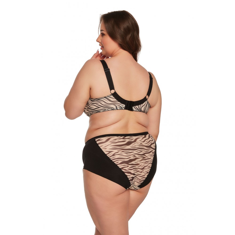 Этот полумягкий бюстгальтер создан на основе популярного бюстгальтера Sonia-1058. Нижняя чашечка с поролоновым вкладышем, прикрывающим сосок, и хлопковой подкладкой внутри. Внешняя чашечка и пояс выполнены из мягкой эластичной ткани с анималистичным принтом. Верхняя чашечка без вкладыша выполнена из эластичной сетки с плоской черной полоской и натягивается высоко на бретельку. Бюстгальтер идеально приподнимает и поддерживает грудь, имеет среднюю степень закрытия.