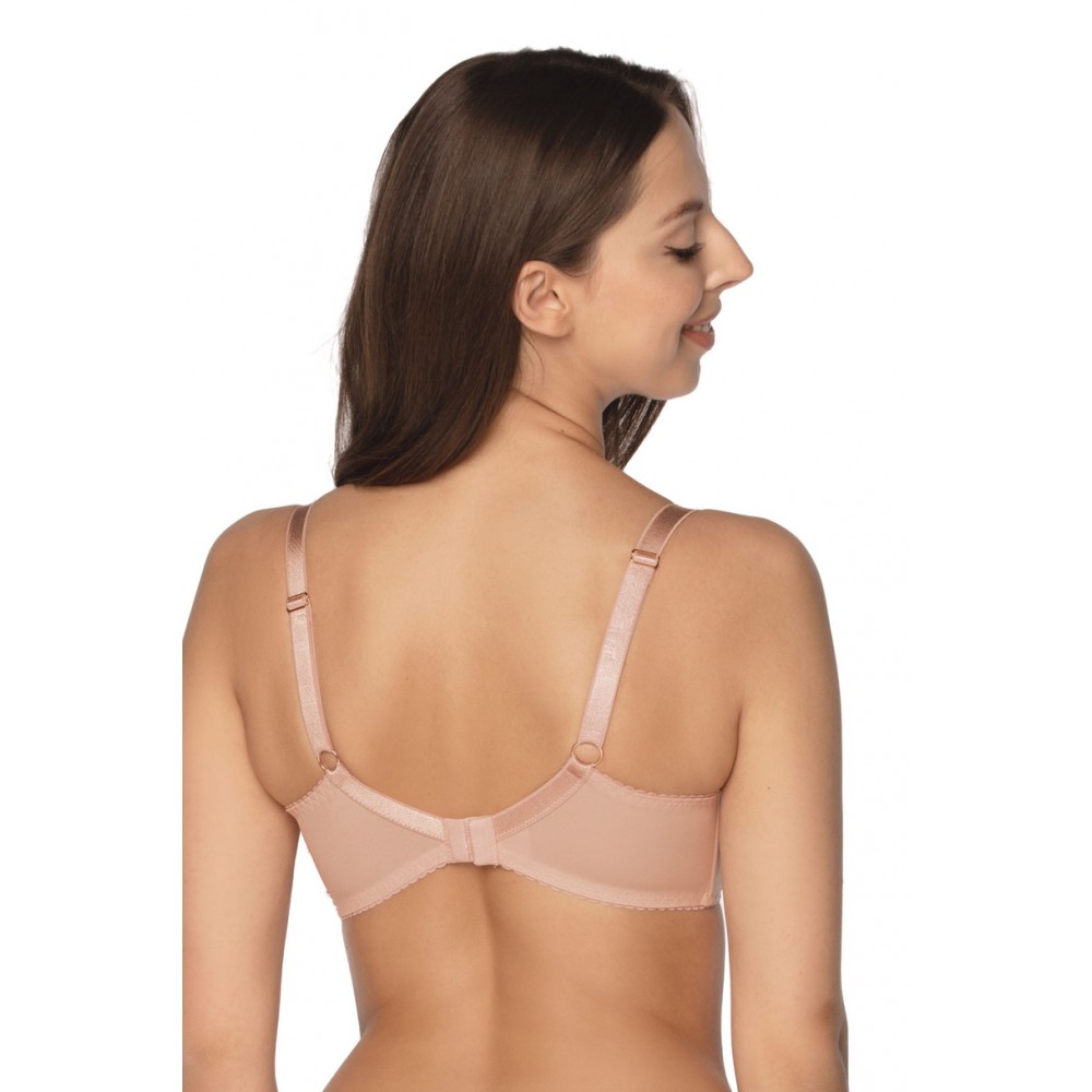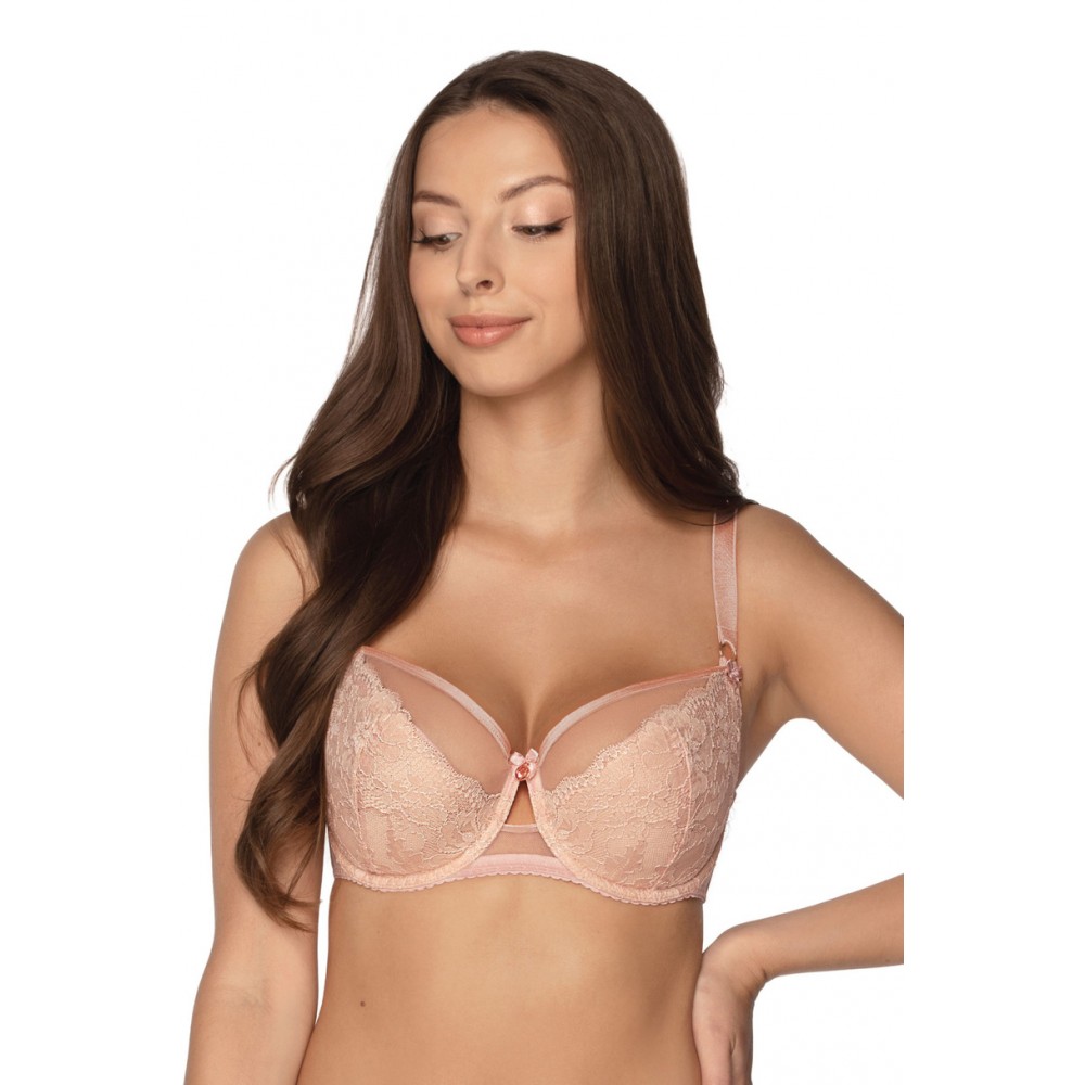 Бюстгальтер на полужесткой основе, нижняя часть чашки из поролона, покрытая эффектным кружевом, верх из тюля, отделанный отделкой.