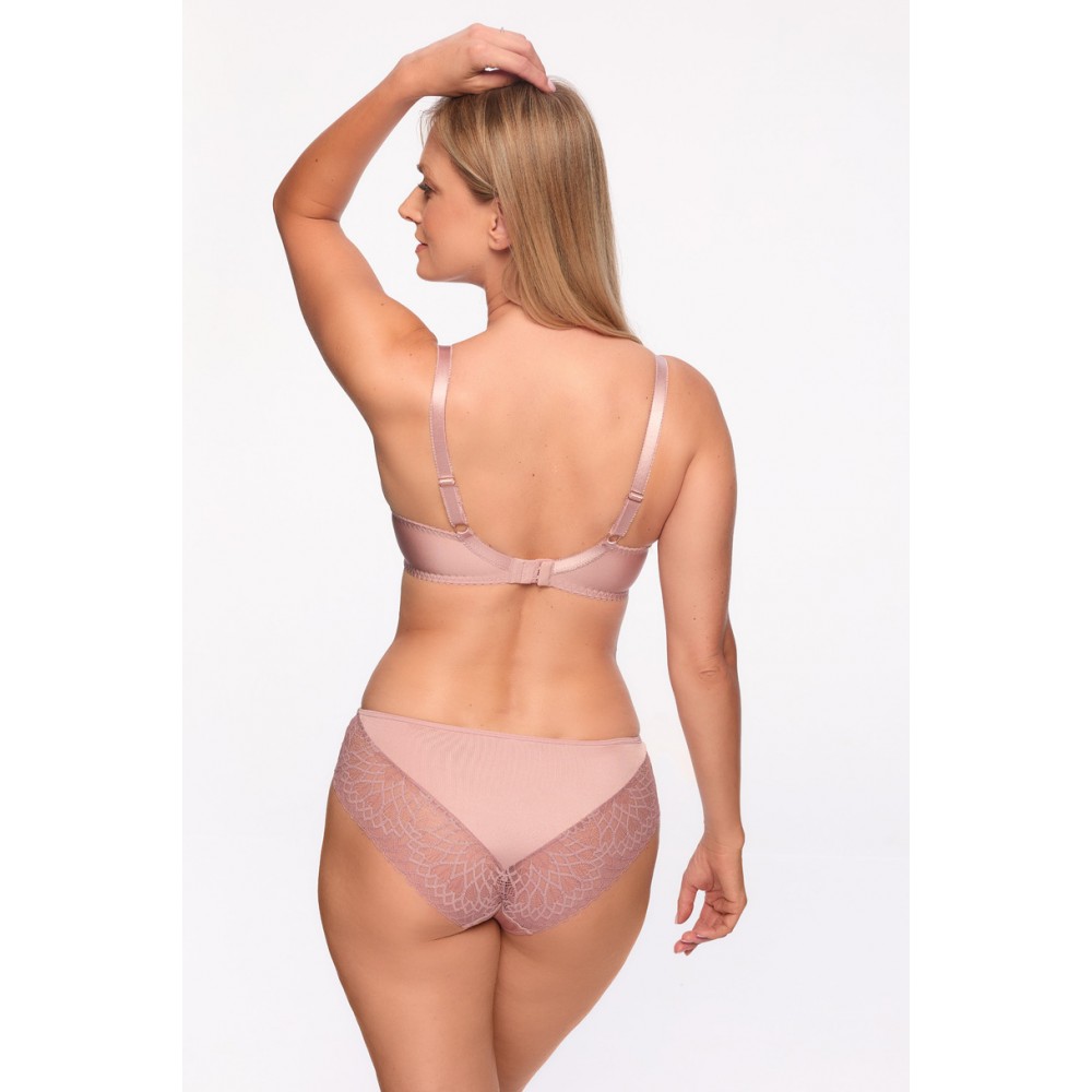 Бюстгальтер Freja 1289 – это полумягкая модель с полууплотнёнными чашечками, сочетающая в себе современную элегантность и максимальный комфорт. Изготовленный из нежного кружева с тонким геометрическим узором, он идеально подчёркивает женственность силуэта. Верхняя чашечка выполнена из нежного тюля с отделкой лентой, а удлинённая часть – из эластичного кружева. Нижняя чашечка с уплотнёнными чашечками покрыта эластичным кружевом. Задняя часть выполнена из плотной микрофибры.