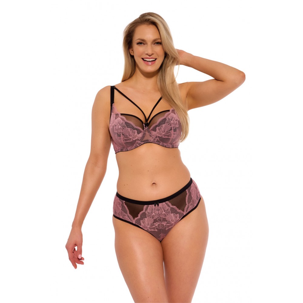 Полумягкое кружево со съёмными бретелями на вырезе. Верхняя чашечка выполнена из чёрного тюля. Нижняя чашечка выполнена из поролона с отделкой из чёрного хлопка и покрыта розовым кружевом, переходящим в бретельку. Спинка выкроена из лайкры.