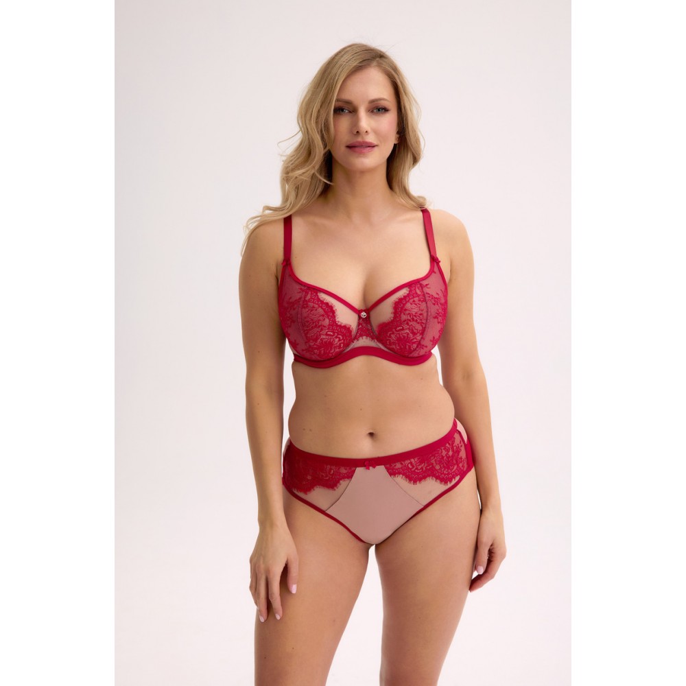 Изготовленный из прозрачного тюля и украшенный насыщенным красным кружевом, он пленяет своей лёгкостью и элегантностью. Конструкция на косточках и тщательно продуманный крой обеспечивают комфортную посадку и надежную поддержку даже для пышной груди. Этот фасон идеально подходит для особых случаев и повседневных образов с высоким вырезом.