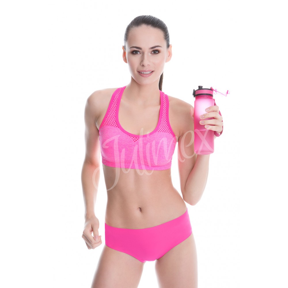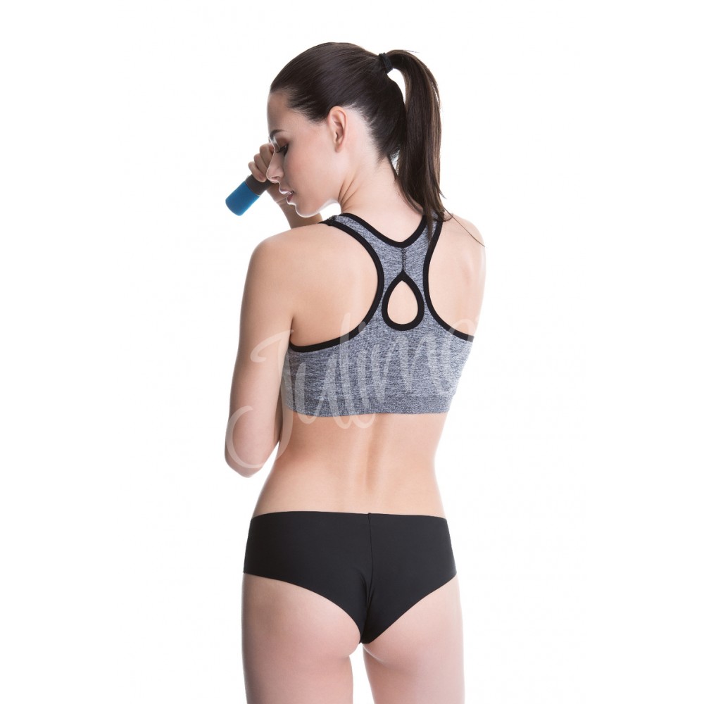 Бесшовный бюстгальтер для занятий спортом. Изготовлен из высококачественной полиамидно-полиэстеровой пряжи. Съёмные, соединённые между собой чашки остаются на месте во время занятий спортом, идеально подчёркивая форму груди. Состав: 66% полиамид, 30% полиэстер, 4% эластан.