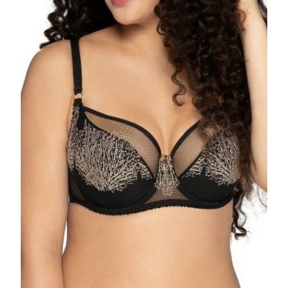Полумягкий бюстгальтер, чашечки из узорной сетки на кружевной подкладке. Модель не имеет вертикальны..