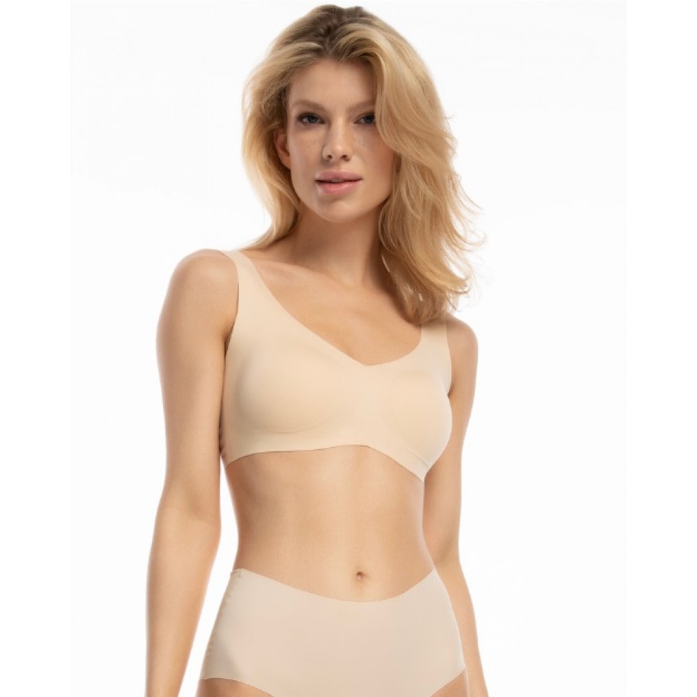 Мягкий бюстгальтер из красивой, нежной сеточки. Верх из бежевого тюля. Бретели несъемные, регулируем..