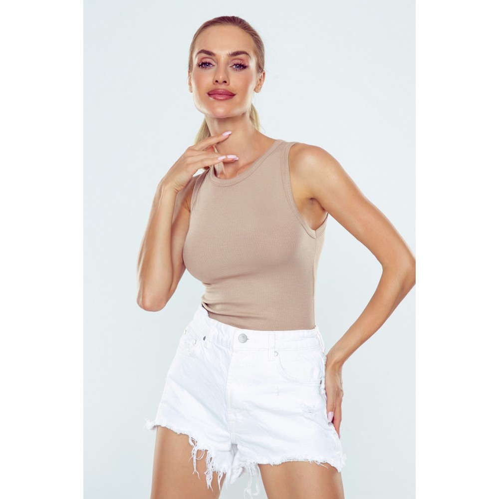 Этот топ-топ на тонких бретелях выполнен из эластичной ткани в рубчик. Вырез отделан декоративным кр..