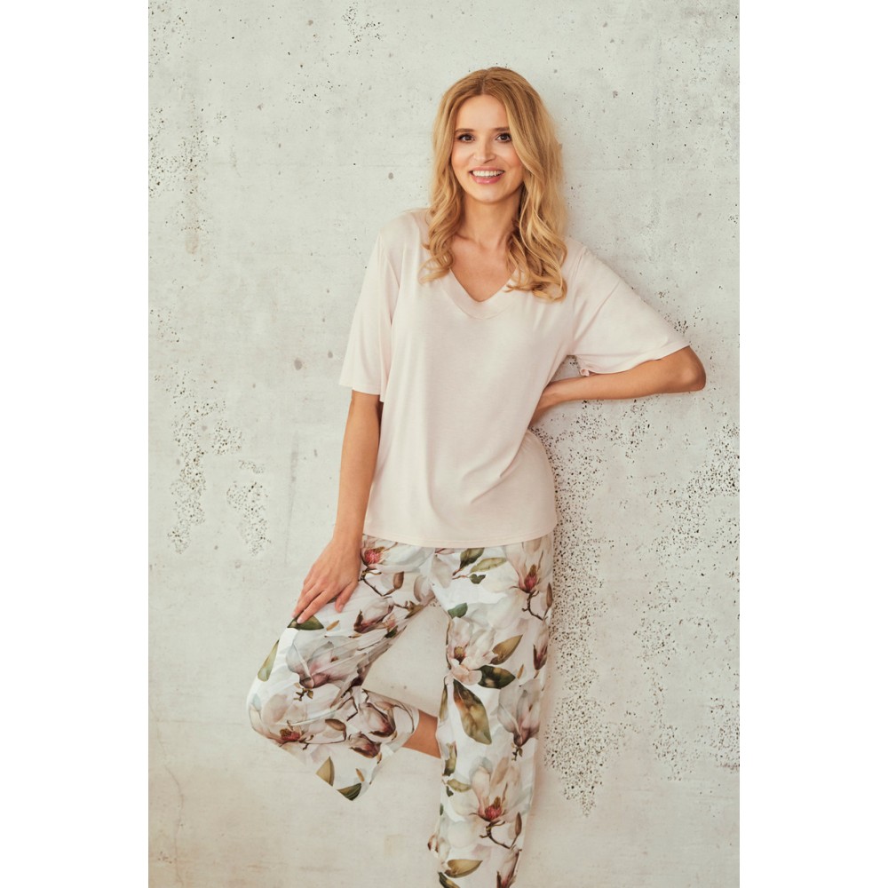 Брюки длиной 7/8 имеют яркий, красочный цветочный принт, что придает пижаме свежесть и романтичность. Удобный эластичный пояс с хлопковой отделкой обеспечивает идеальную посадку без давления. Пижама AFRODYTA идеально подходит как для сна, так и для отдыха дома, а также стильный и практичный подарок.