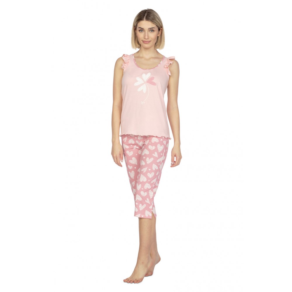 Женская пижама на широких бретельках, изготовлена из высококачественного хлопка. Принт на груди. Капри с узором и тонкими вырезами.