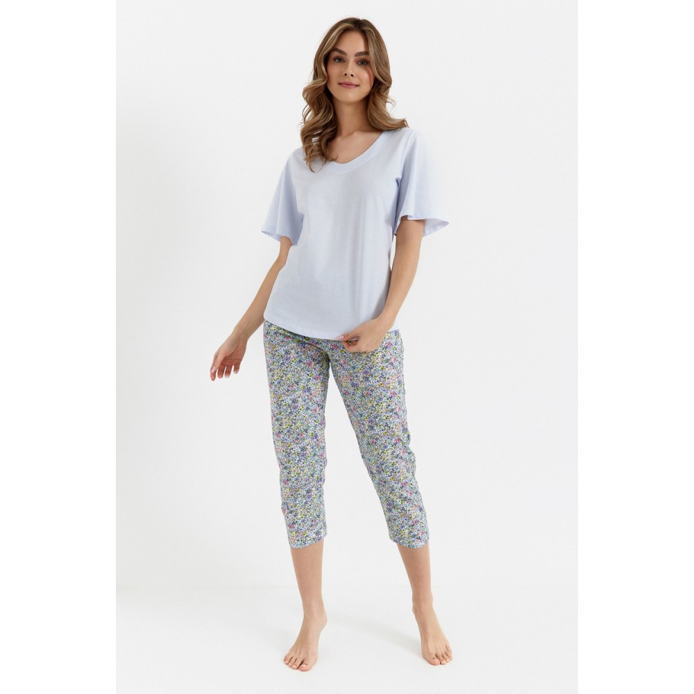 Model wyróżnia się krótkim rękawem oraz spodniami o długości 7/8, co czyni go doskonałym wyborem zarówno na cieplejsze noce, jak i jako wygodny strój domowy. Praktyczne kieszenie dodają funkcjonalności, umożliwiając przechowywanie drobnych przedmiotów. Subtelny, kobiecy design sprawia, że piżama wygląda stylowo, a jednocześnie zapewnia maksymalną wygodę.