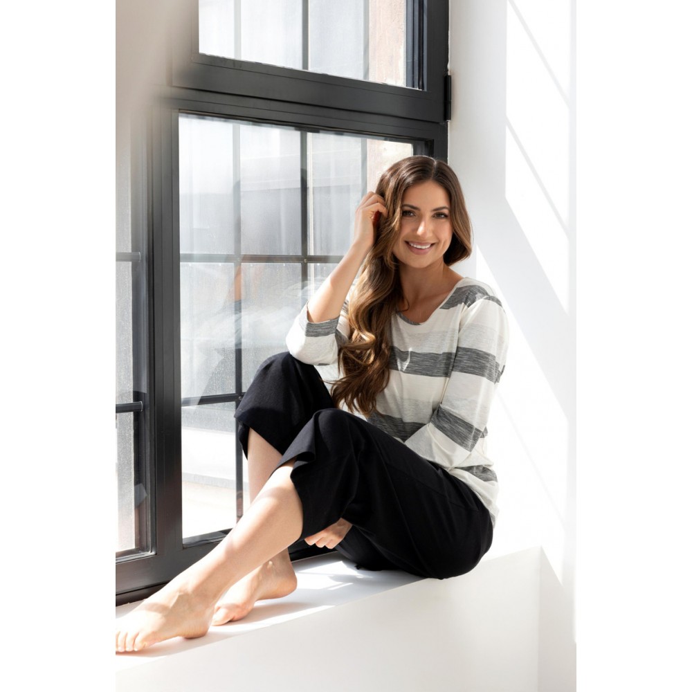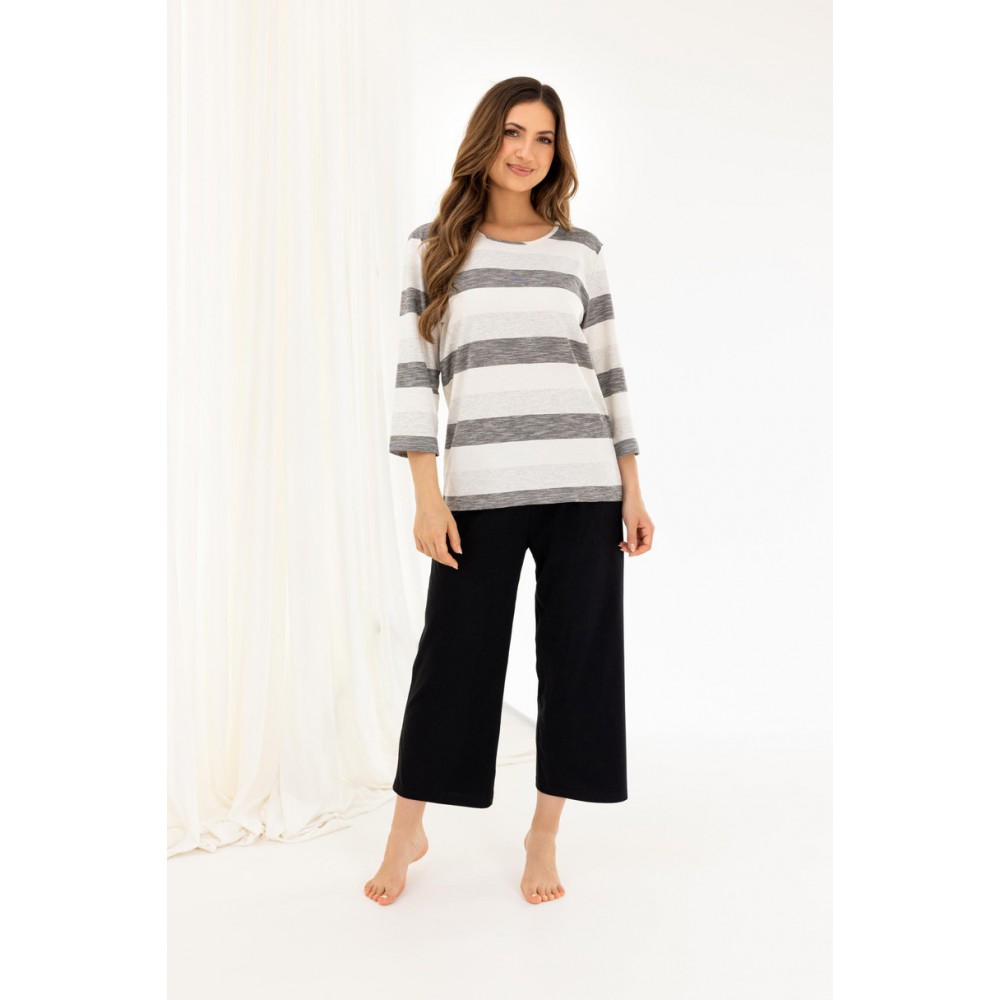 Женский пижамный комплект 719 J/25 – это комфортный комплект, идеальный для теплых вечеров и ежедневного отдыха в уюте вашего дома. Топ с рукавами 3/4 и круглым вырезом горловины изготовлен из мягкой и эластичной вискозы с добавлением эластана, что обеспечивает идеальную посадку. Комплект также включает в себя широкие брюки 3/4 длины из 100% дышащего хлопка, гарантирующие комфорт и свободу движений. Эти пижамы сочетают современный стиль с функциональностью – идеально подходят для весны и лета.