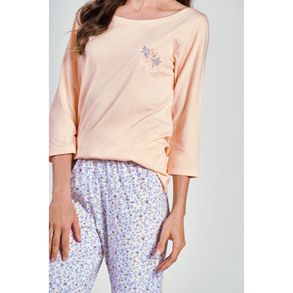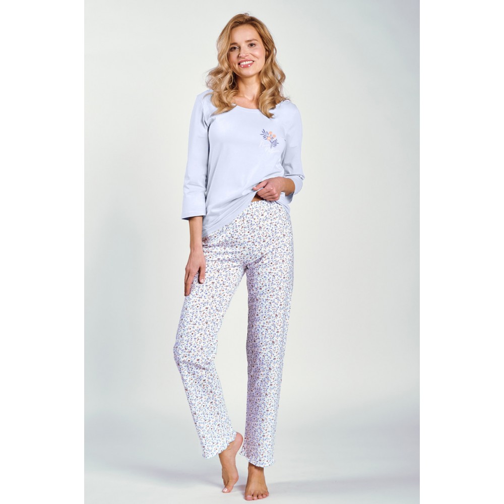 Женская пижама с рукавами 7/8, однотонная с принтом на груди. Длинные брюки с узором в тон.