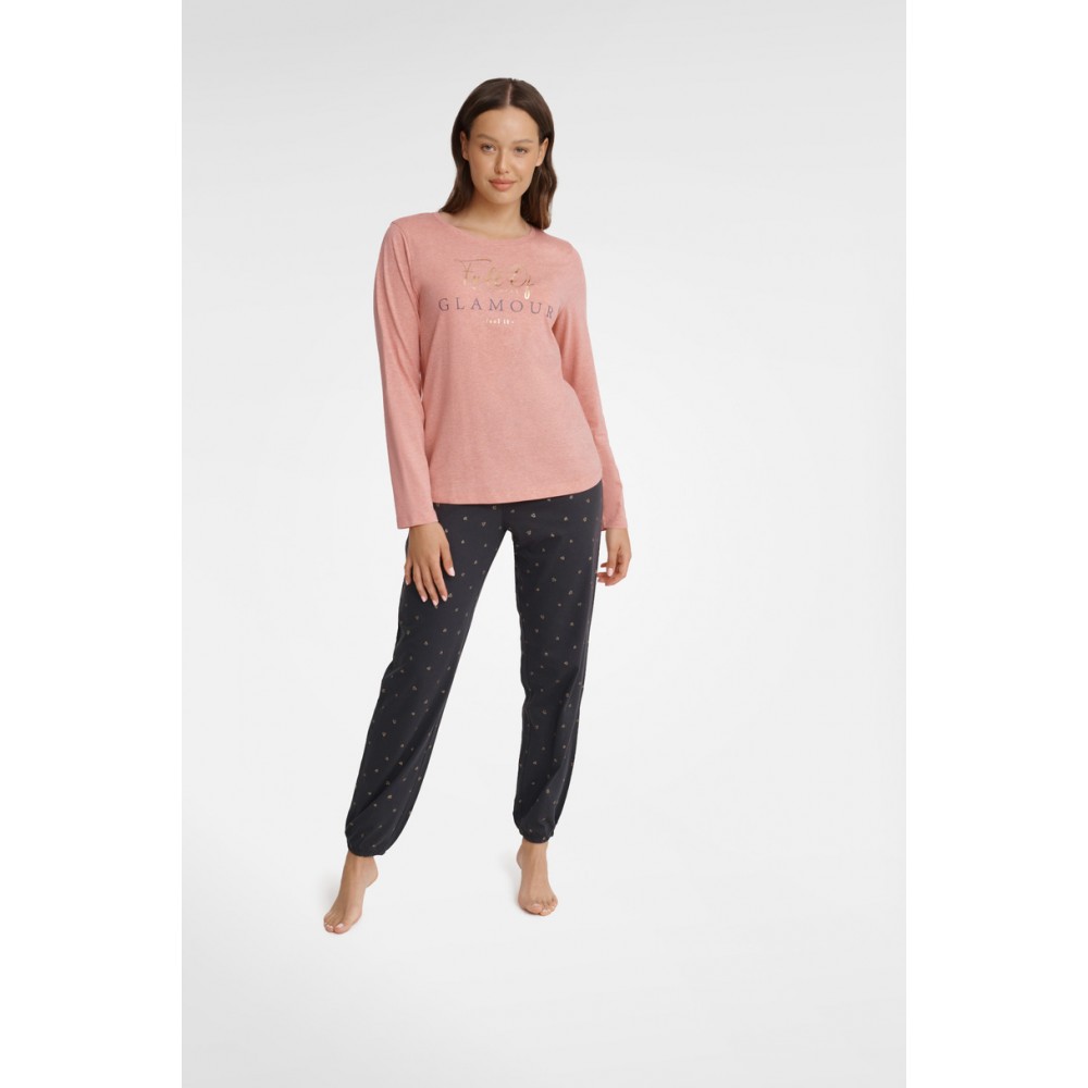 Женская пижама из мягкого хлопка. Футболка с длинными рукавами, длинные брюки и круглый вырез горловины.