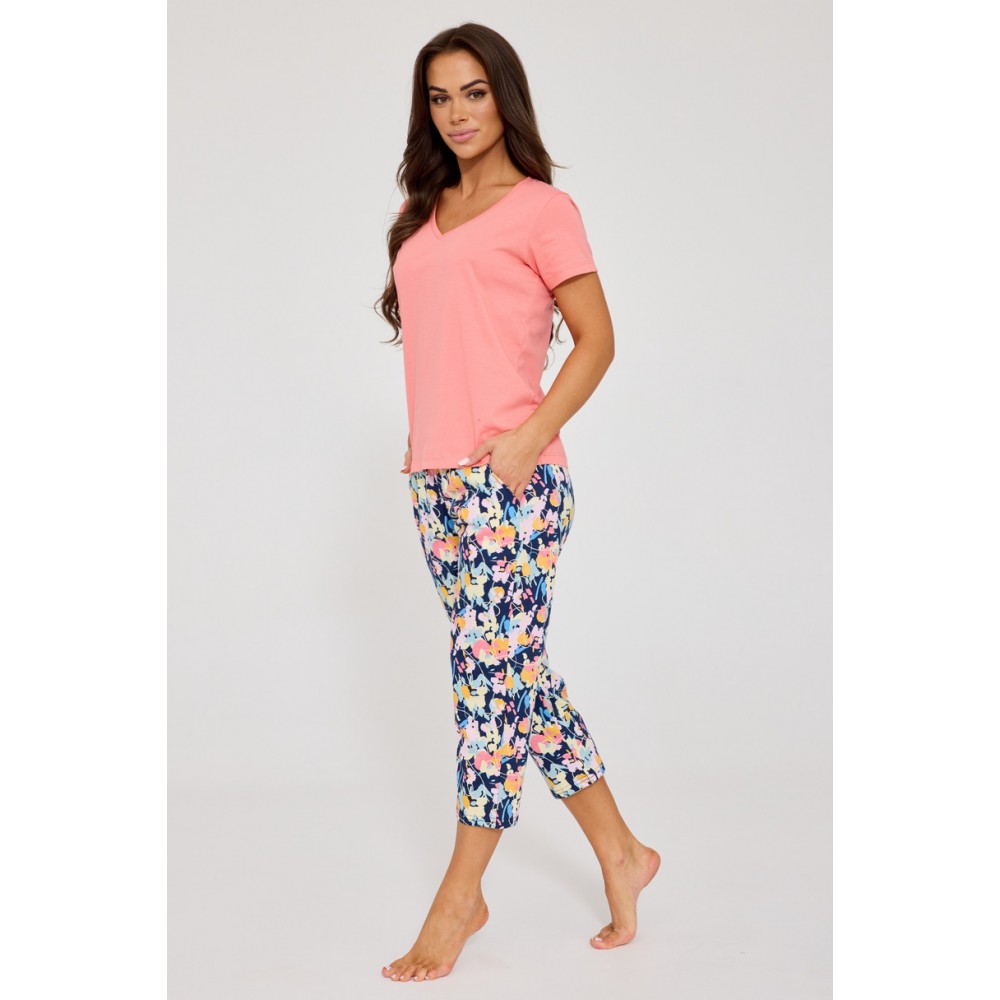 Эта простая блузка с короткими рукавами имеет женственный V-образный вырез , который деликатно подчеркивает силуэт и добавляет легкости образу. В комплект входят брюки длиной 7/8 с практичными карманами на бедрах. Эластичный пояс с хлопковой отделкой обеспечивает идеальную посадку без давления. Это идеальный выбор как для вечера дома, так и для неспешного утра.