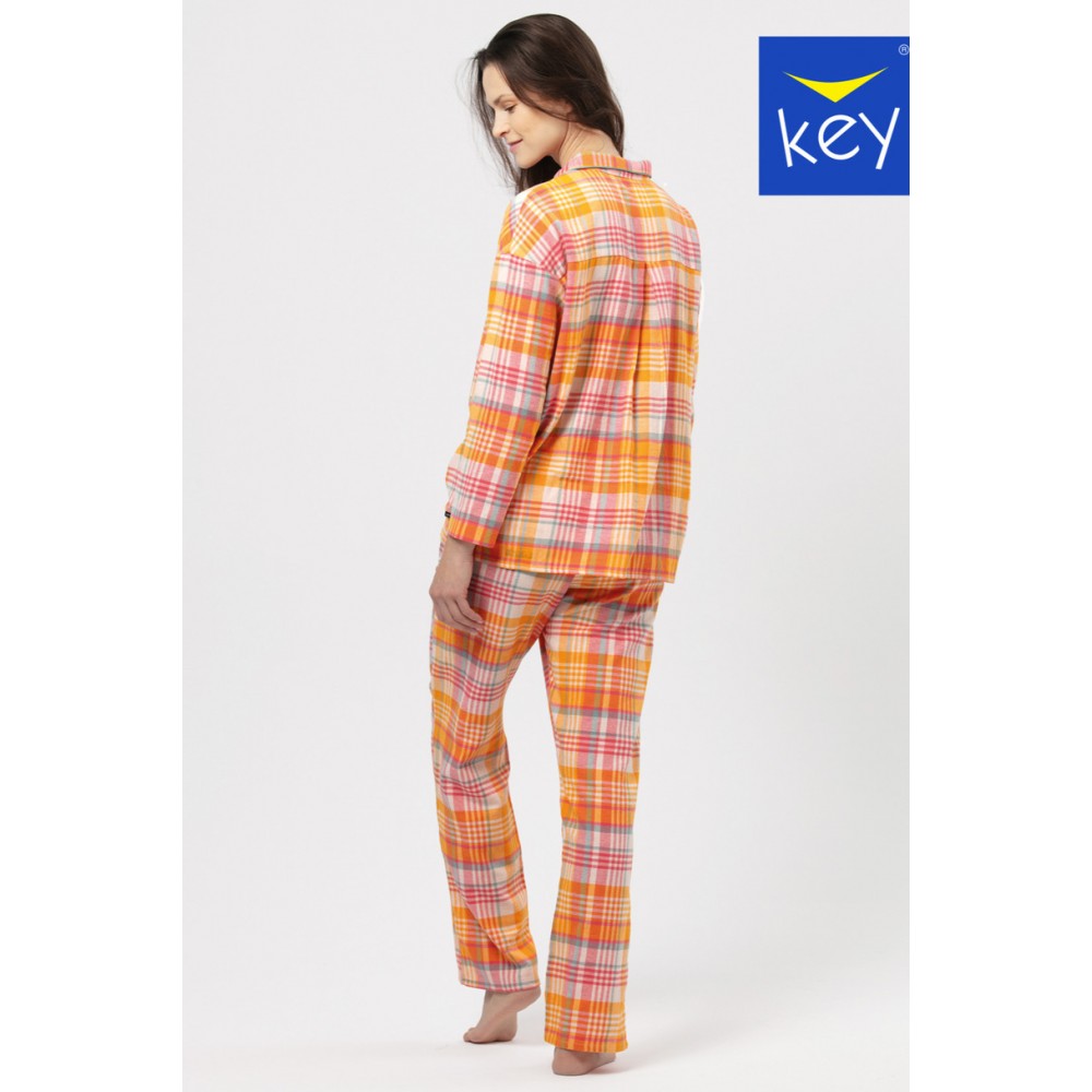 Женская пижама из клетчатой хлопчатобумажной фланели, украшенной мерцающими нитями. Свитер с длинными рукавами на пуговицах имеет воротник. Комплект включает в себя длинные брюки с карманами и удобный эластичный пояс. Теплая и отлично мягкая фланелевая ткань идеально подходит для прохладных зимних вечеров.