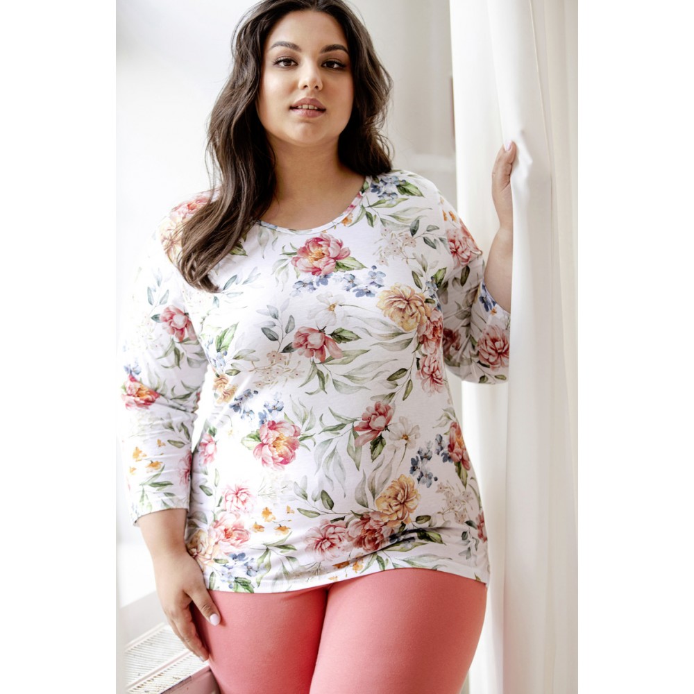 Женская пижама с рукавами 3/4, изготовлена из мягкого хлопка. Блузка имеет V-образный вырез горловины. К ней подходят однотонные штаны 3/4.