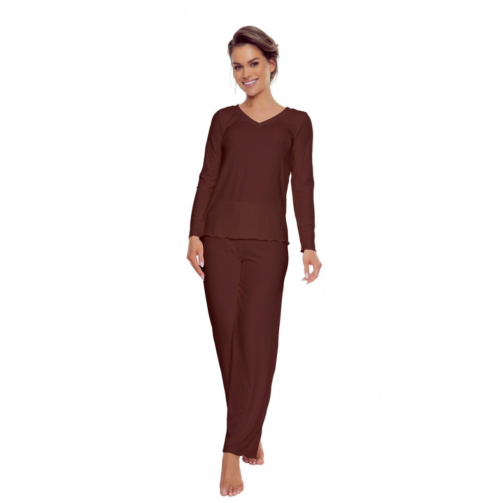 Женская пижама Rosaria сочетает в себе элегантность и комфорт, предназначенная для женщин, которые ценят комфорт и стиль даже в уюте собственного дома. Изготовлена из легкой ребристой вискозы, она нежно облегает тело и позволяет коже дышать. Блузка с V-образным вырезом нежно подчеркивает силуэт, а декоративное деление придает женственности. Прямые длинные брюки гарантируют полный комфорт и свободу движений. Идеально подходит как ночная рубашка или стильная одежда для отдыха на дому.